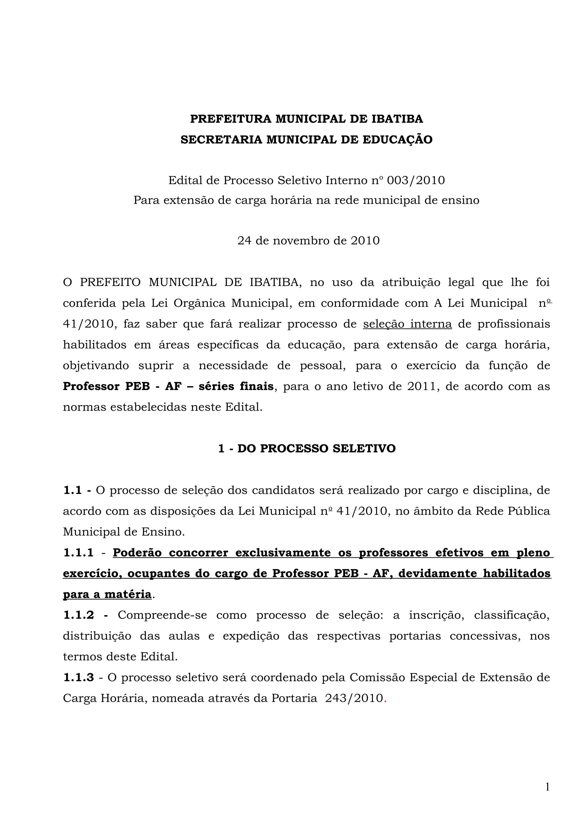 Este documento descreve o edital de um processo seletivo interno para extensão de carga horária de professores na rede municipal de ensino de Ibatiba, ES. O processo seletivo visa preencher vagas para professores das séries finais até o limite de 44 horas semanais. O edital define os requisitos para inscrição e classificação dos candidatos com base em tempo de serviço e titulação.