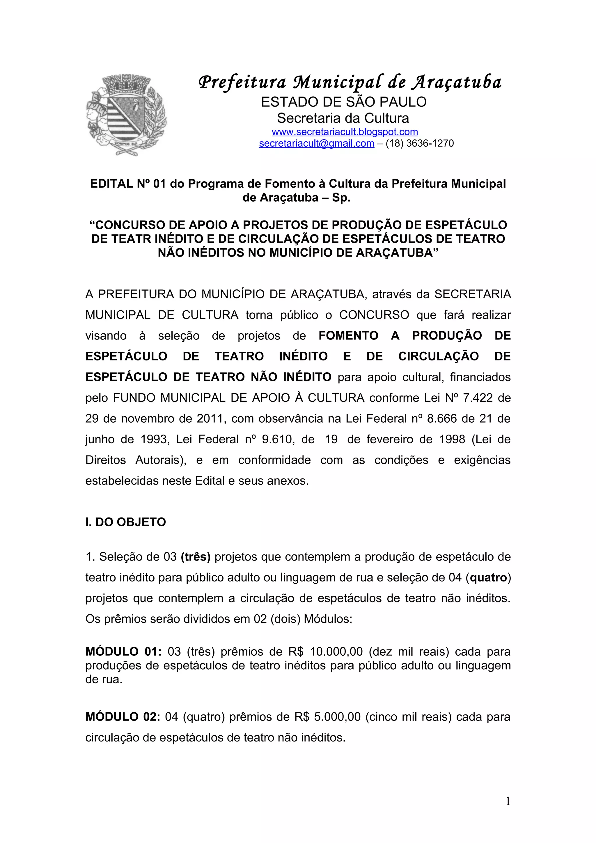 O documento é um edital de concurso cultural da Prefeitura de Araçatuba que visa selecionar projetos de produção de espetáculos de teatro inéditos e de circulação de espetáculos já existentes. Serão selecionados 3 projetos de teatro inédito com prêmio de R$10.000 cada e 4 projetos de circulação com prêmio de R$5.000 cada, totalizando R$50.000 em apoio. Os projetos devem cumprir requisitos e contrapartidas como apresentações gratuitas.