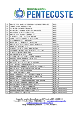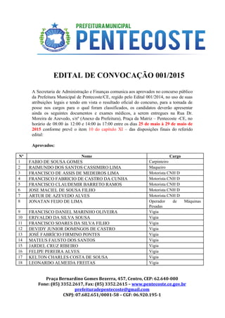 O documento convoca aprovados em concurso público para tomarem posse nos cargos, devendo apresentar documentos e exames médicos de 25 a 29 de maio. A lista contém 127 nomes aprovados para diversos cargos na prefeitura de Pentecoste.