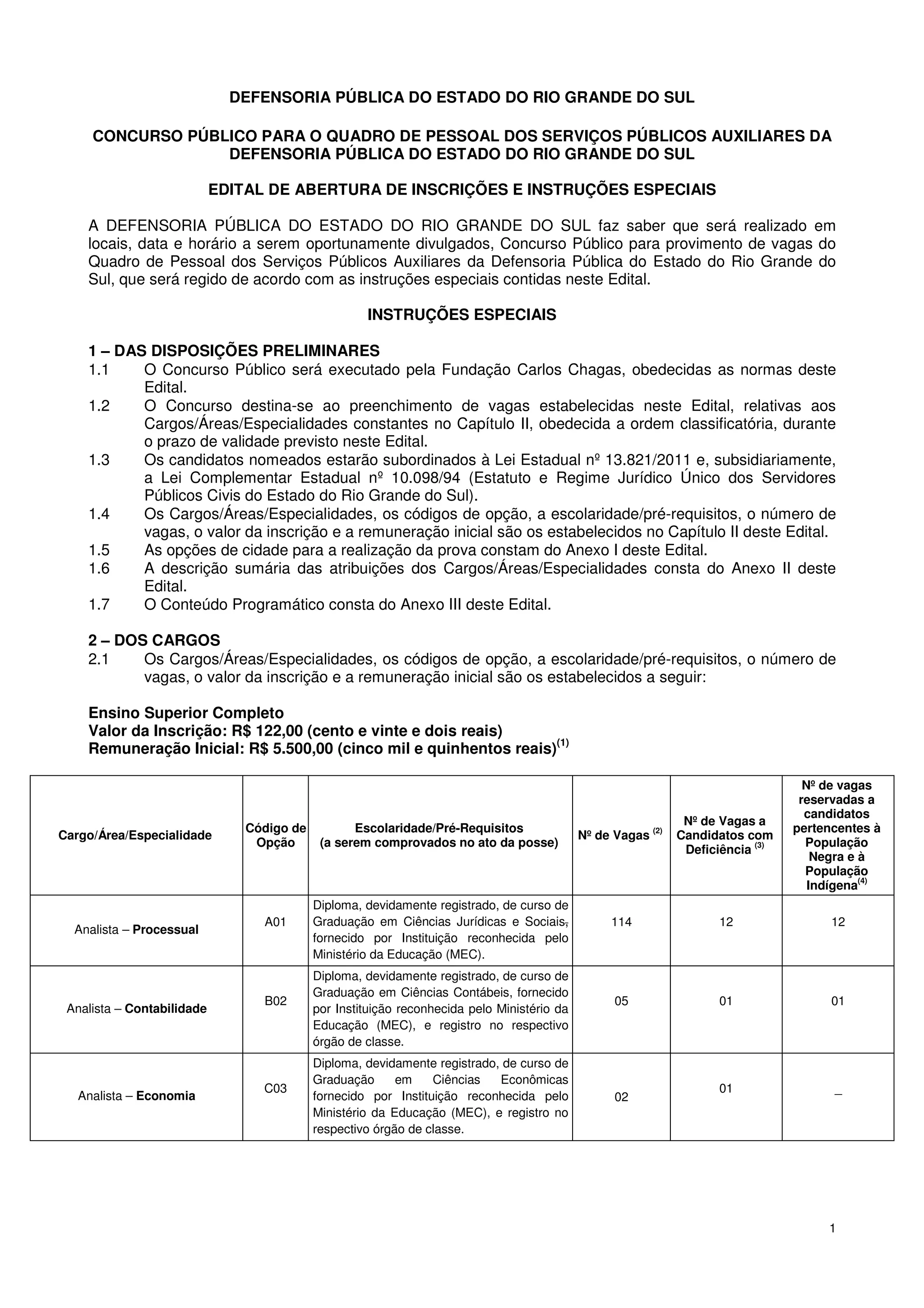 Este documento anuncia um concurso público para preenchimento de vagas no quadro de pessoal da Defensoria Pública do Rio Grande do Sul. Ele lista os cargos disponíveis, requisitos, número de vagas, salários e cidades onde as provas serão aplicadas. Há vagas para nível superior e médio em diversas áreas como direito, medicina, enfermagem e tecnologia da informação.
