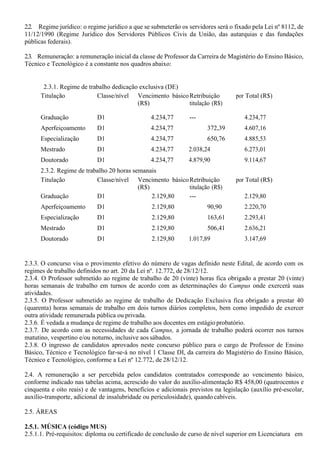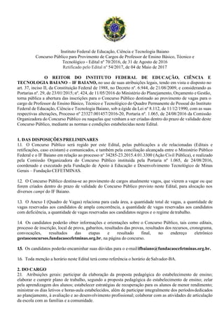 Este documento anuncia a abertura de inscrições para um concurso público para o cargo de professor no Instituto Federal de Educação, Ciência e Tecnologia Baiano. Ele define as áreas e pré-requisitos para o cargo, a remuneração, o regime jurídico e os requisitos para investidura no cargo.