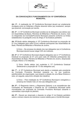 A Comissão Provisória Municipal do Partido Comunista do Brasil no Cabo de Santo Agostinho convoca a 10a Conferência Municipal para 4 de setembro de 2011. O documento estabelece as normas para a realização da conferência, incluindo a ordem do dia, eleição de delegados, participação dos militantes e realização de assembleias de base.