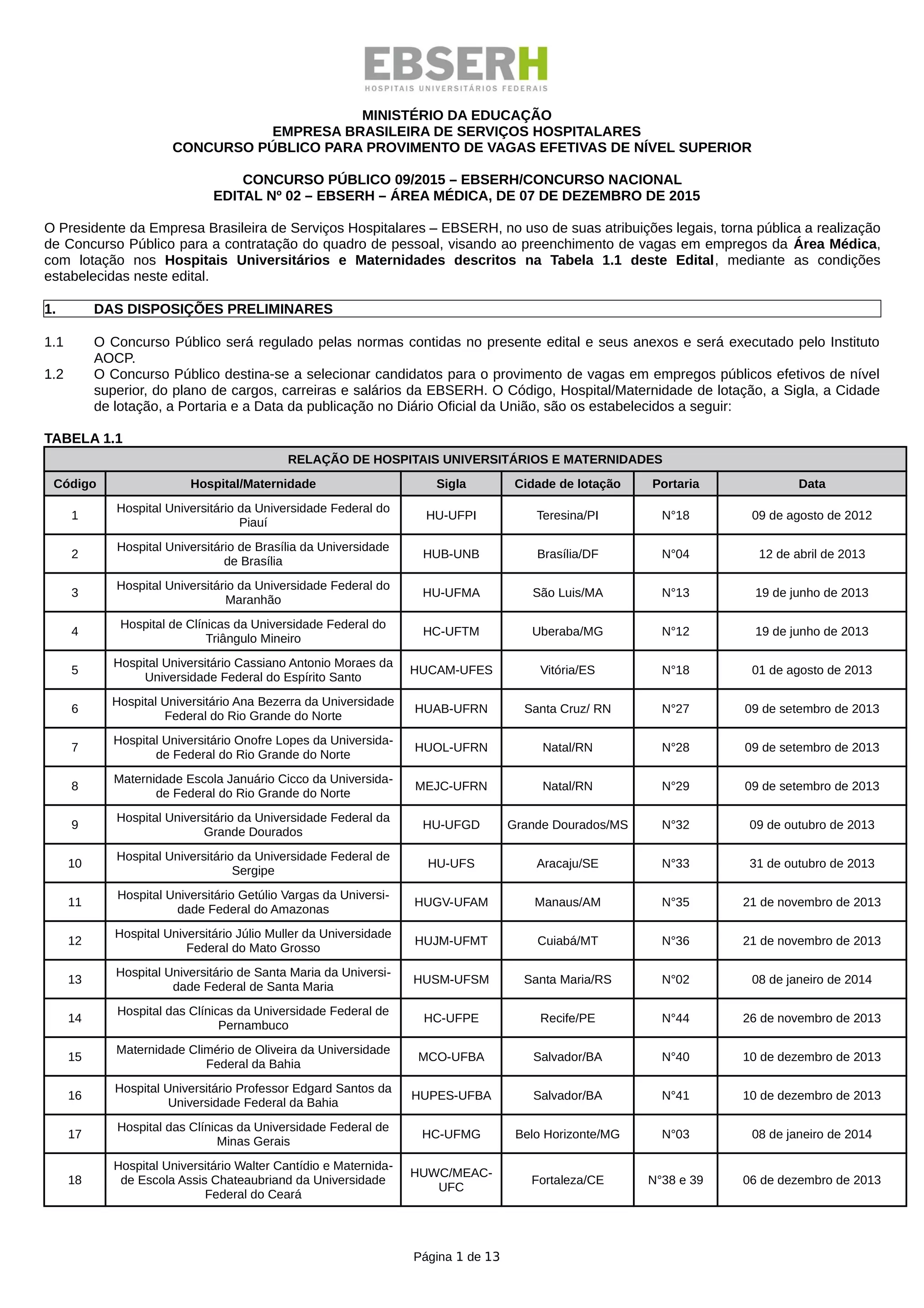 Este documento anuncia um concurso público para contratação de pessoal em empregos de nível superior na Empresa Brasileira de Serviços Hospitalares (EBSERH). O concurso visa preencher vagas em 27 hospitais e maternidades universitárias federais em diversas cidades brasileiras. O concurso consistirá de prova objetiva eliminatória e classificatória e avaliação de títulos e experiência, de caráter classificatório. O documento detalha os requisitos para inscrição e contratação, as etapas