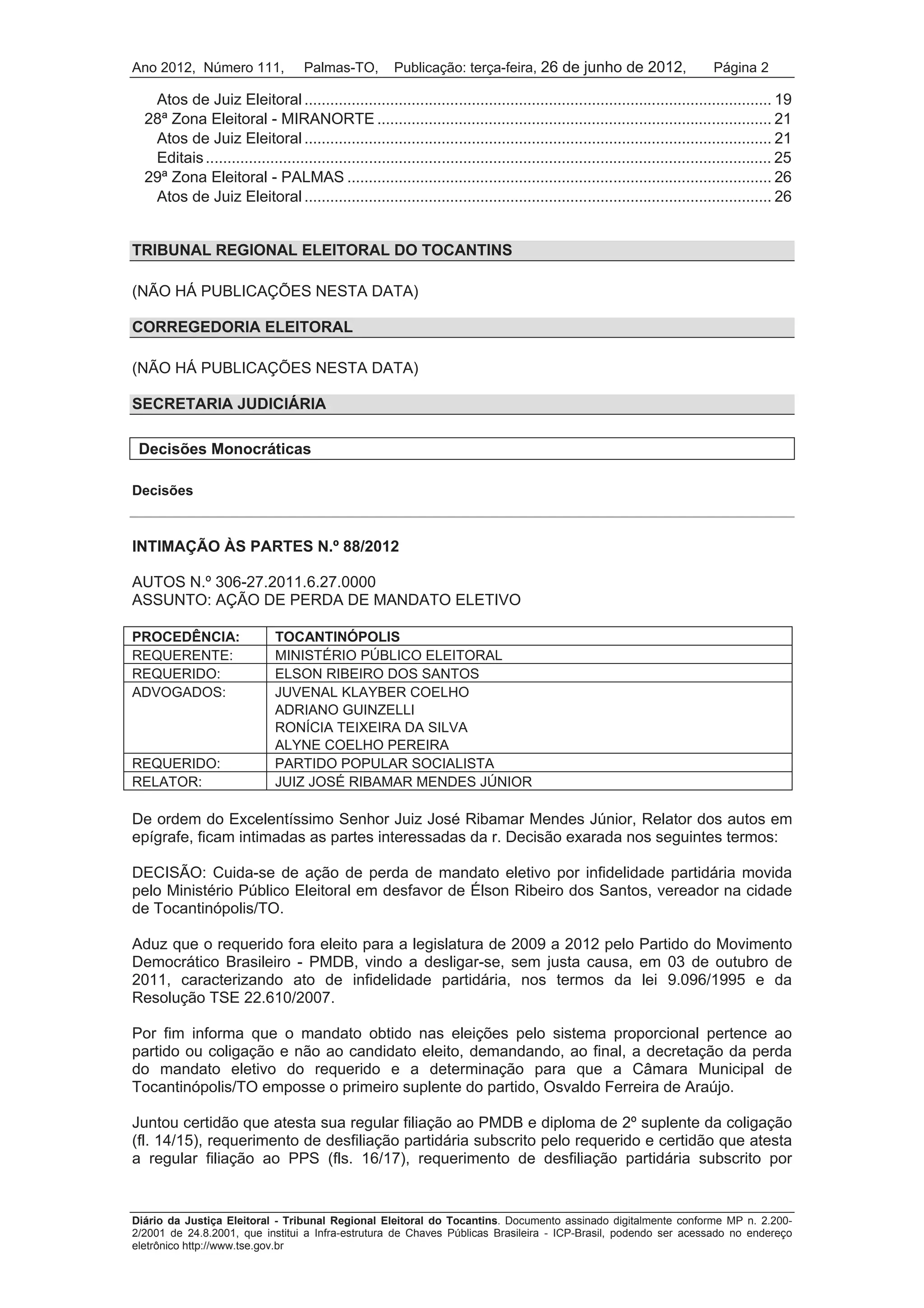O documento relata três atos judiciais eleitorais: 1) Uma decisão que julgou procedente uma ação de perda de mandato eletivo por infidelidade partidária, porém reconheceu a decadência do direito de requerer a ação; 2) Intimações às partes da decisão; 3) Publicações de atos de juízes eleitorais de diferentes zonas eleitorais.