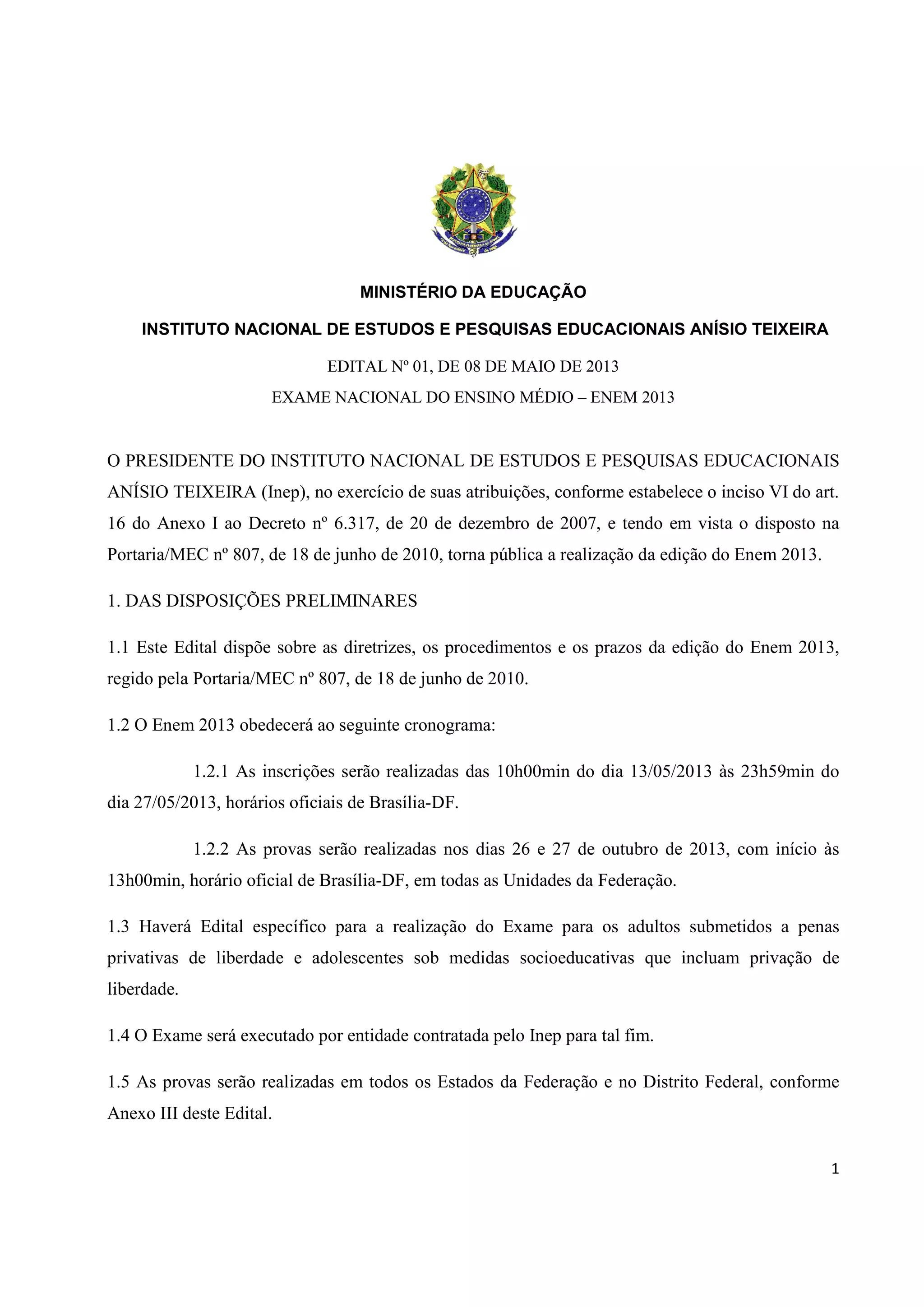 Este documento descreve as diretrizes e procedimentos do Exame Nacional do Ensino Médio (ENEM) de 2013, incluindo o cronograma das inscrições e provas, disposições sobre atendimento diferenciado e específico para participantes com necessidades especiais, taxa de inscrição e isenções, e objetivos e usos dos resultados do exame.