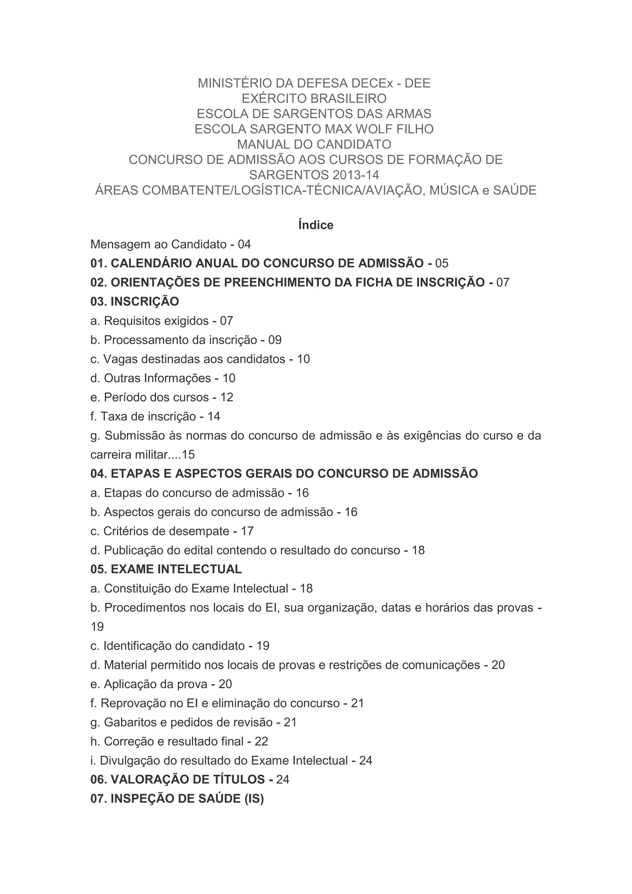 1. O documento apresenta as orientações e o calendário do concurso de admissão aos Cursos de Formação de Sargentos do Exército Brasileiro para 2013-2014.