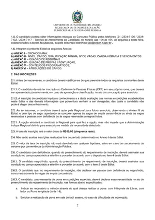 O edital anuncia um concurso público para o cargo de inspetor de alunos na Secretaria de Estado de Educação do Rio de Janeiro, com 909 vagas disponíveis e regido por normas específicas. As inscrições podem ser feitas presencialmente ou online, com uma taxa de R$50, e existem condições especiais para candidatos com deficiência e opções de isenção. O concurso incluirá uma prova objetiva, a ser realizada em diferentes municípios, conforme escolha do candidato durante a inscrição.