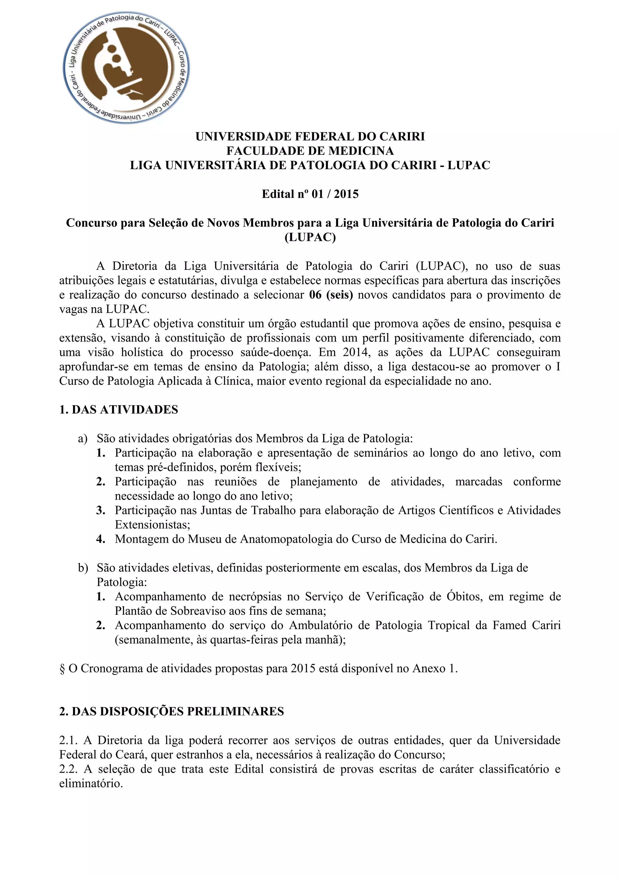 1) A Liga Universitária de Patologia do Cariri está abrindo seleção para 6 novas vagas e definindo atividades obrigatórias e eletivas para os membros em 2015.