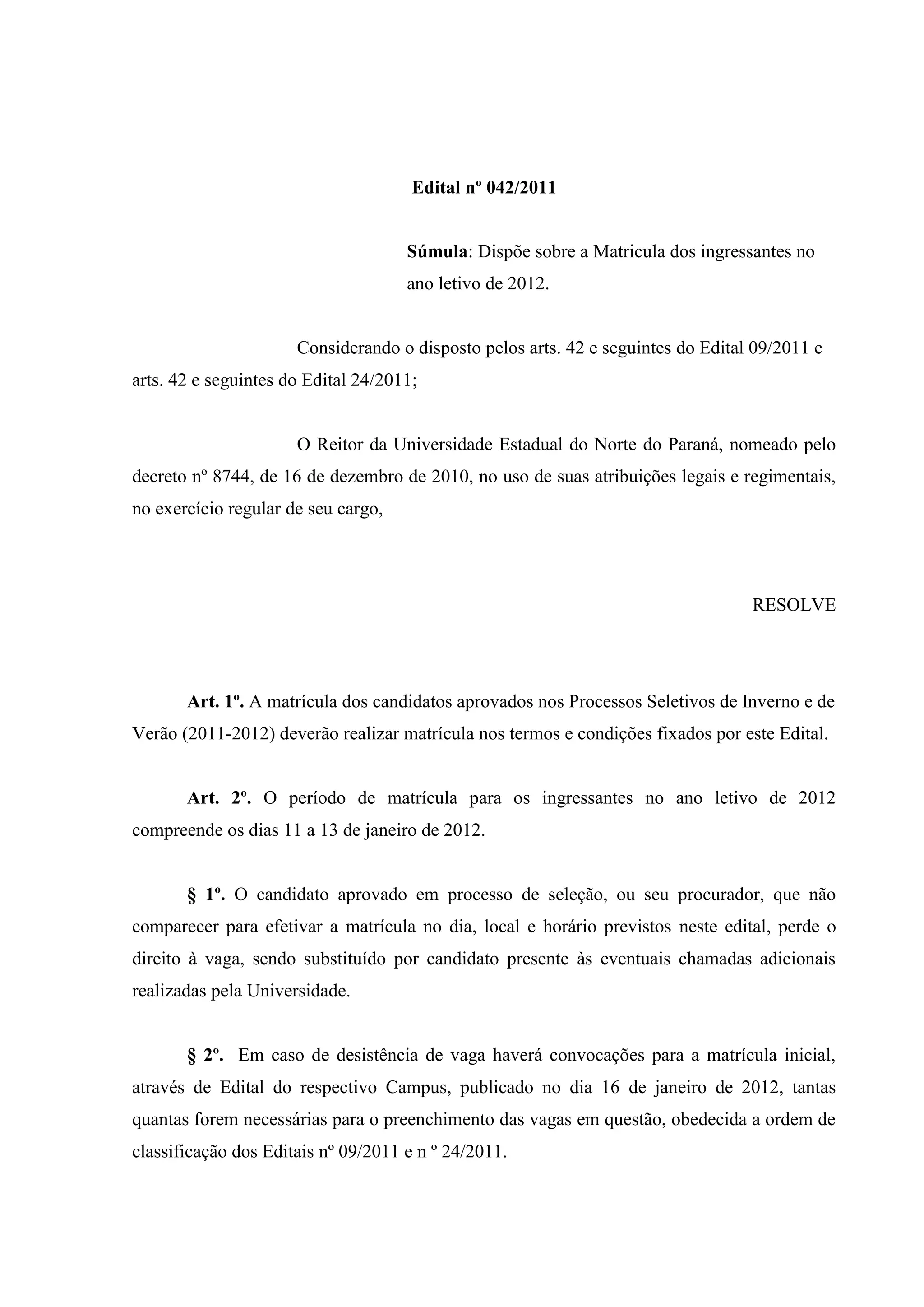 Este edital estabelece as datas, locais e documentos necessários para a matrícula dos ingressantes na Universidade Estadual do Norte do Paraná no ano letivo de 2012, compreendendo os dias 11 a 13 de janeiro. Candidatos ausentes perderão a vaga. Em caso de desistências, novas chamadas ocorrerão em 16 de janeiro e 23 de janeiro.