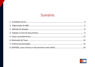 Este documento descreve as regras e critérios para seleção de estudantes de medicina para participar do Núcleo Brasil-Cuba (NBC) em 2015. O programa oferece 60 vagas divididas em duas edições de 21 dias em Havana, Cuba. Os candidatos devem se inscrever online e ter seus documentos validados por um representante da faculdade. A seleção será feita por ordem de pontuação com base em experiências acadêmicas e participação em eventos da DENEM.