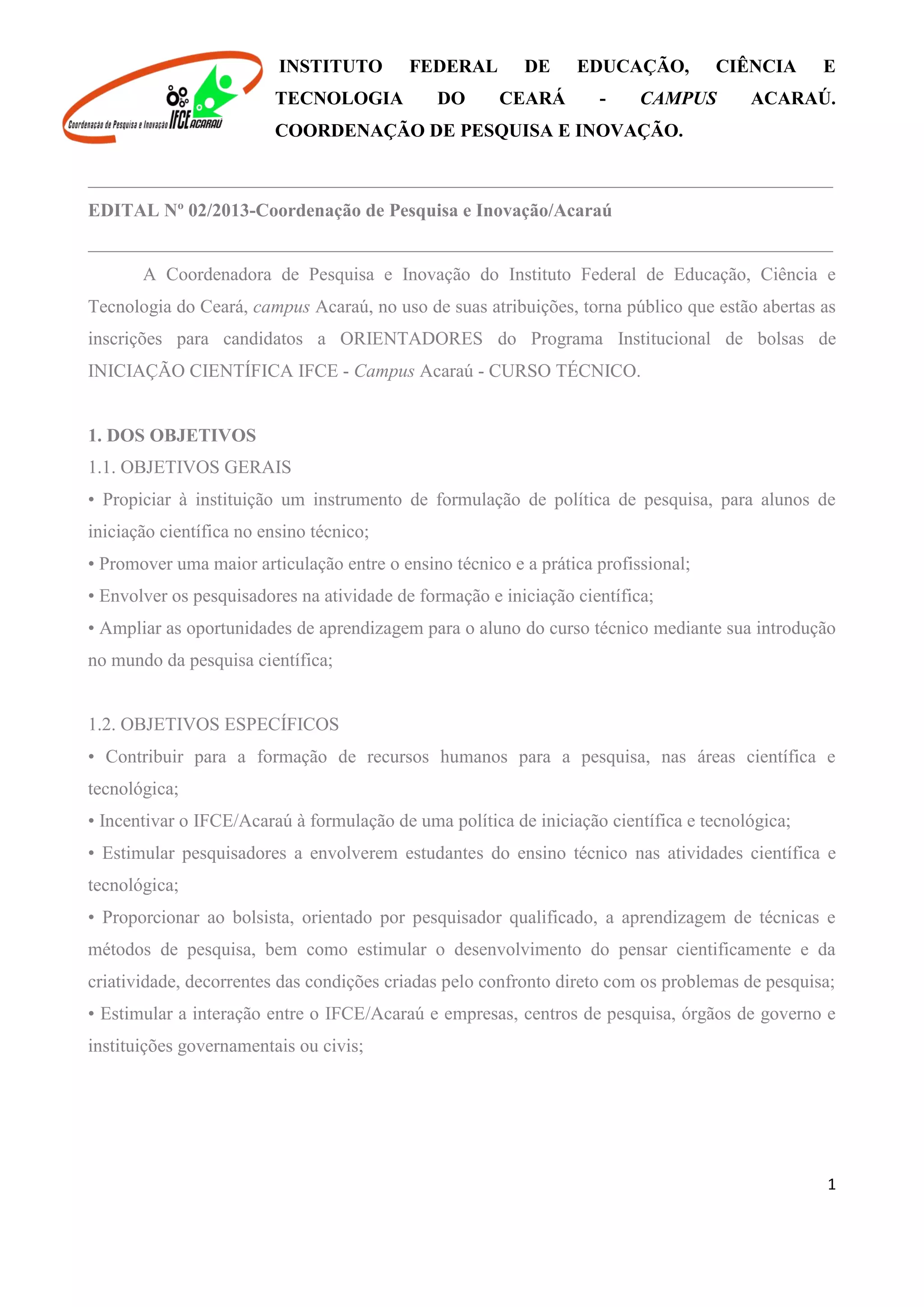 Este edital descreve as diretrizes para o Programa de Bolsas de Iniciação Científica do Instituto Federal de Educação, Ciência e Tecnologia do Ceará - Campus Acaraú. Ele define os requisitos e compromissos para orientadores e bolsistas, o processo de inscrição e seleção, e o cronograma para concessão de 2 bolsas no valor de R$339,00 cada para projetos de pesquisa a serem desenvolvidos entre setembro de 2013 e setembro de 2014.