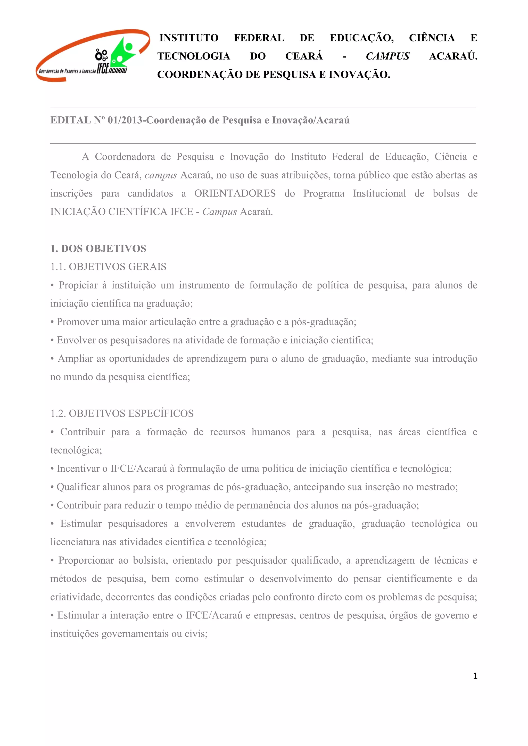 Este edital visa selecionar orientadores e bolsistas para o Programa de Iniciação Científica do Instituto Federal de Educação, Ciência e Tecnologia do Ceará - Campus Acaraú. Serão ofertadas 5 bolsas no valor de R$360,00 cada para projetos de pesquisa a serem desenvolvidos entre setembro de 2013 a setembro de 2014 sob a orientação de professores do campus.
