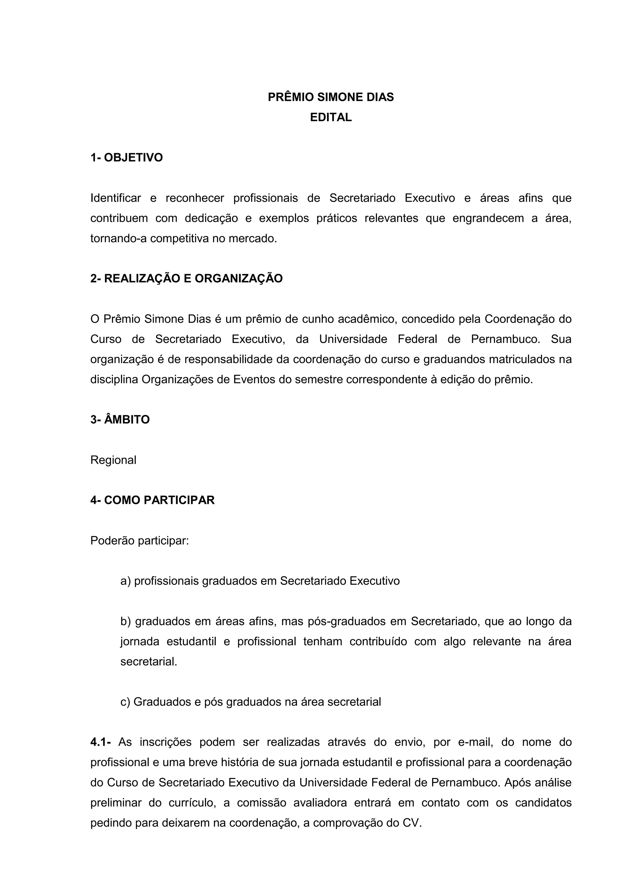 O documento descreve o Prêmio Simone Dias, concedido pela Universidade Federal de Pernambuco para reconhecer profissionais de secretariado executivo e áreas afins que contribuíram para a área. O prêmio será organizado por estudantes de eventos e premiará aquele profissional que forneça a contribuição mais relevante à área secretarial, tendo a cerimônia de premiação em 31 de maio de 2012 na universidade.