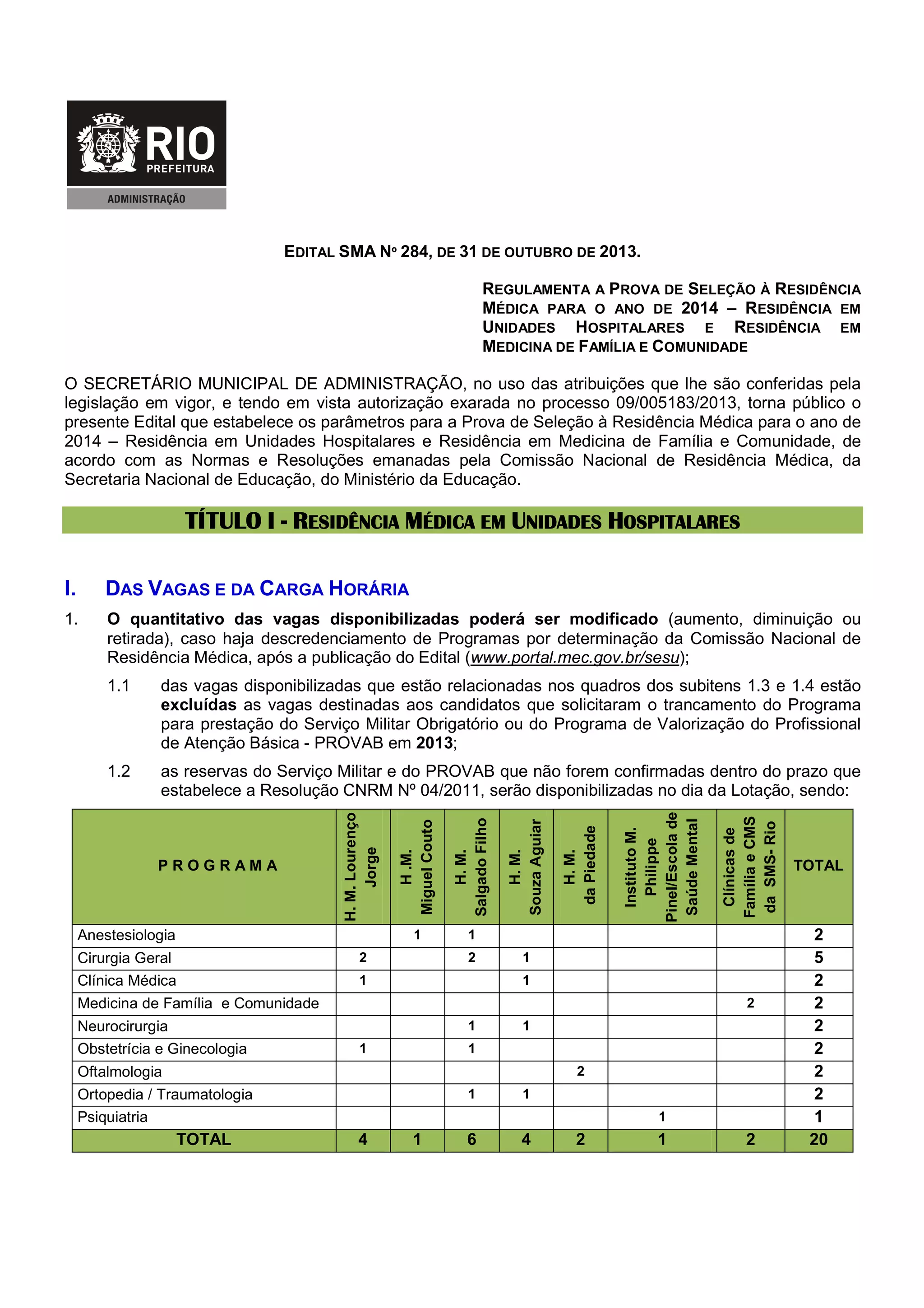Este edital regulamenta a prova de seleção para residência médica em 2014 no município do Rio de Janeiro, estabelecendo as vagas disponíveis em diferentes programas de residência em unidades hospitalares e medicina de família e comunidade, além dos requisitos e critérios para inscrição e seleção.