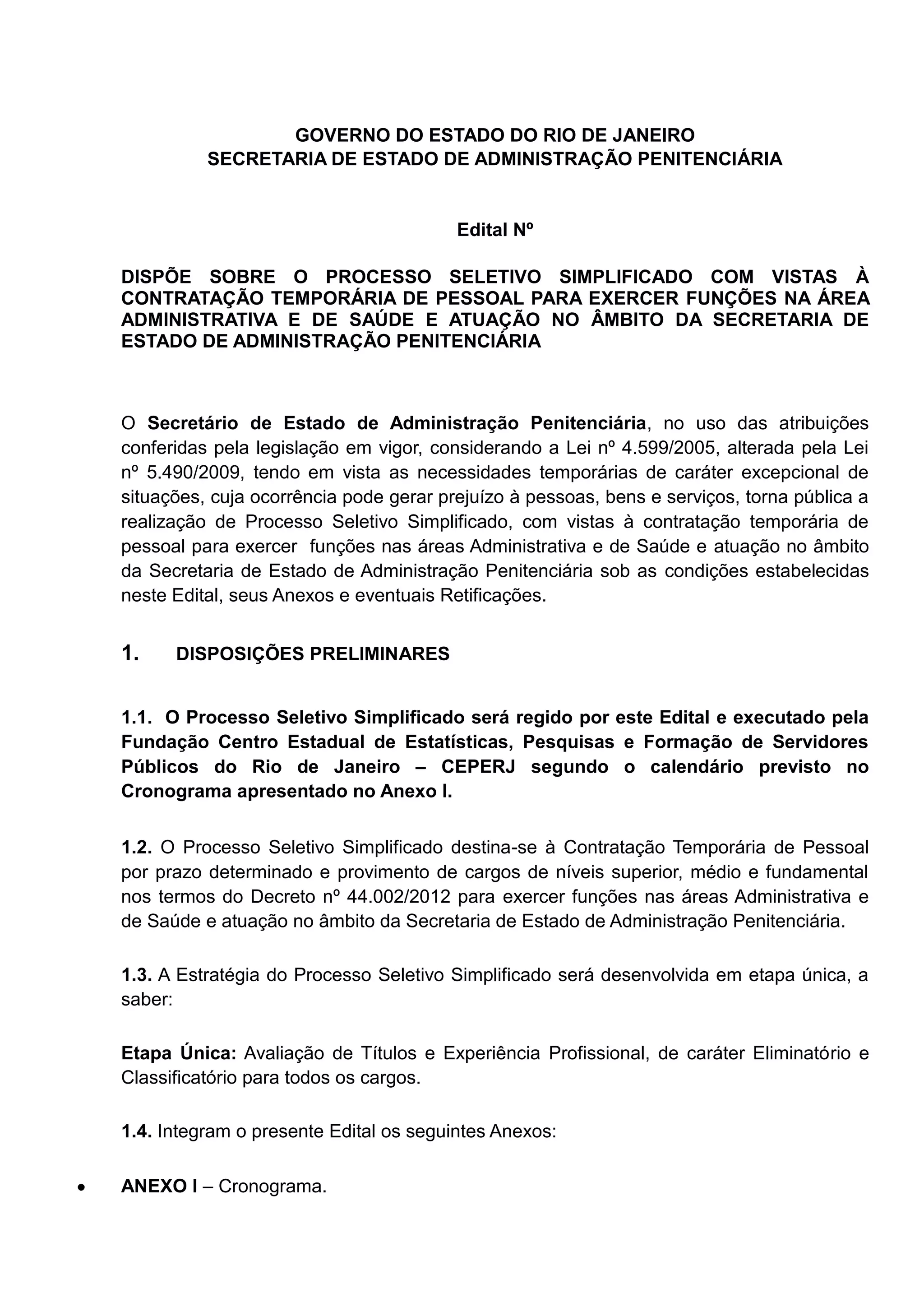 Este documento anuncia um processo seletivo simplificado para contratação temporária de pessoal nas áreas administrativa e de saúde da Secretaria de Administração Penitenciária do Rio de Janeiro. O processo será regido por este edital e executado pela Fundação CEPERJ. Será uma etapa única de avaliação de títulos e experiência profissional. Haverá reserva de vagas para pessoas com deficiência, negros e índios.