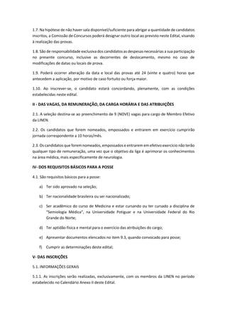 Este edital convoca candidatos para preencher 9 vagas de membro efetivo da Liga de Neurociências de Natal (LINEN). A seleção consistirá em uma prova objetiva com 25 questões sobre neurologia. Os candidatos aprovados cumprirão carga horária de 10 horas por mês sem remuneração, com o objetivo de aprimorar seus conhecimentos médicos.