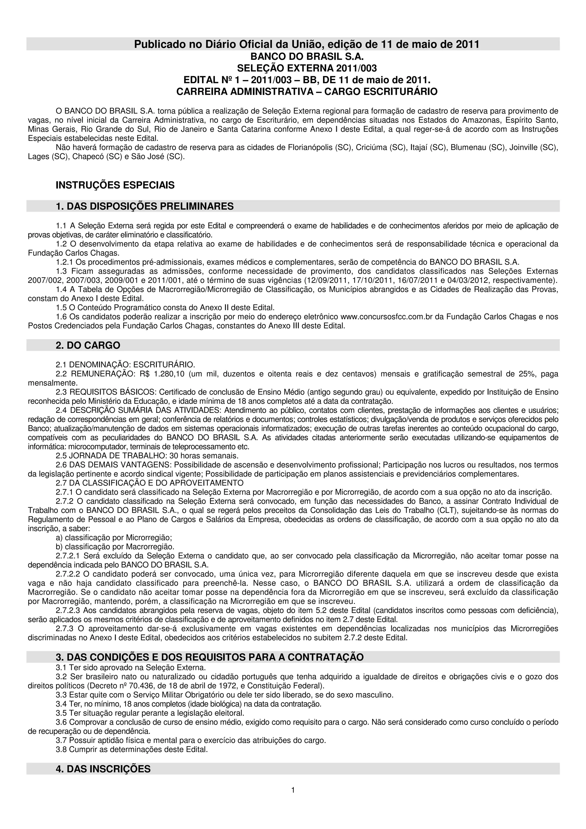 Este documento anuncia uma seleção externa regional para o cargo de escriturário no Banco do Brasil, com provas objetivas a serem realizadas nos estados do Amazonas, Espírito Santo, Minas Gerais, Rio Grande do Sul, Rio de Janeiro e Santa Catarina. O documento detalha os requisitos para o cargo, o processo de inscrição e classificação, e as normas gerais da seleção.