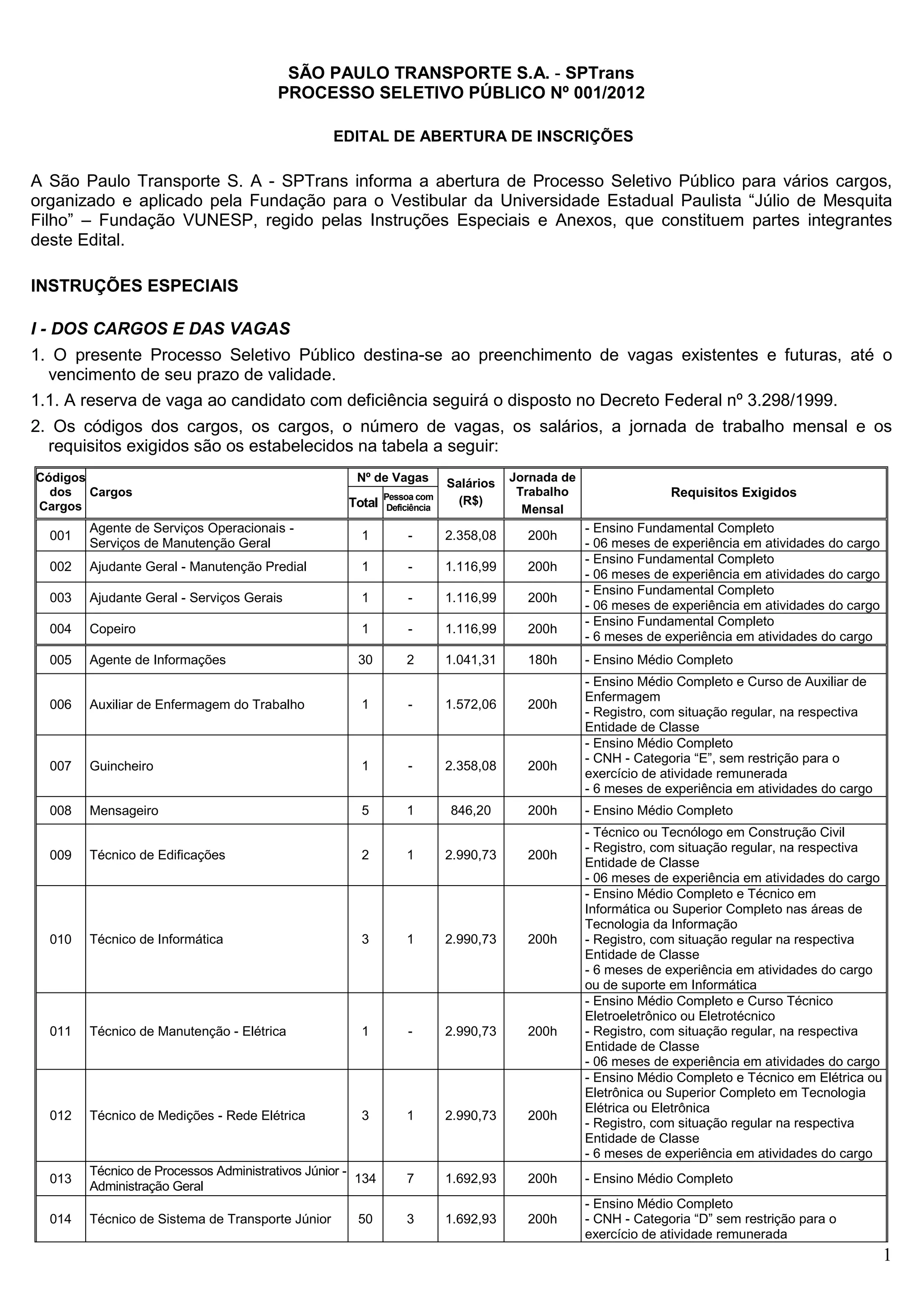 O documento anuncia a abertura de inscrições para um processo seletivo público da SPTrans para diversos cargos. É listado o código, nome, número de vagas, salário, carga horária e requisitos de cada cargo, totalizando 44 descrições.