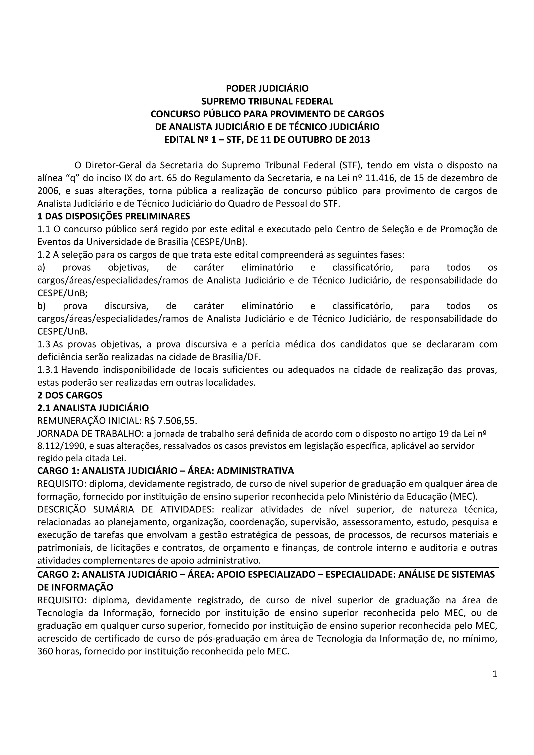 Este edital anuncia a realização de um concurso público para o provimento de cargos de Analista Judiciário e Técnico Judiciário do Supremo Tribunal Federal (STF). Serão ofertadas vagas para diversas áreas e especialidades, com requisitos de escolaridade que variam de nível médio a superior completo, e atribuições relacionadas a apoio administrativo, judiciário e especializado. As etapas do concurso incluem provas objetivas e discursivas.