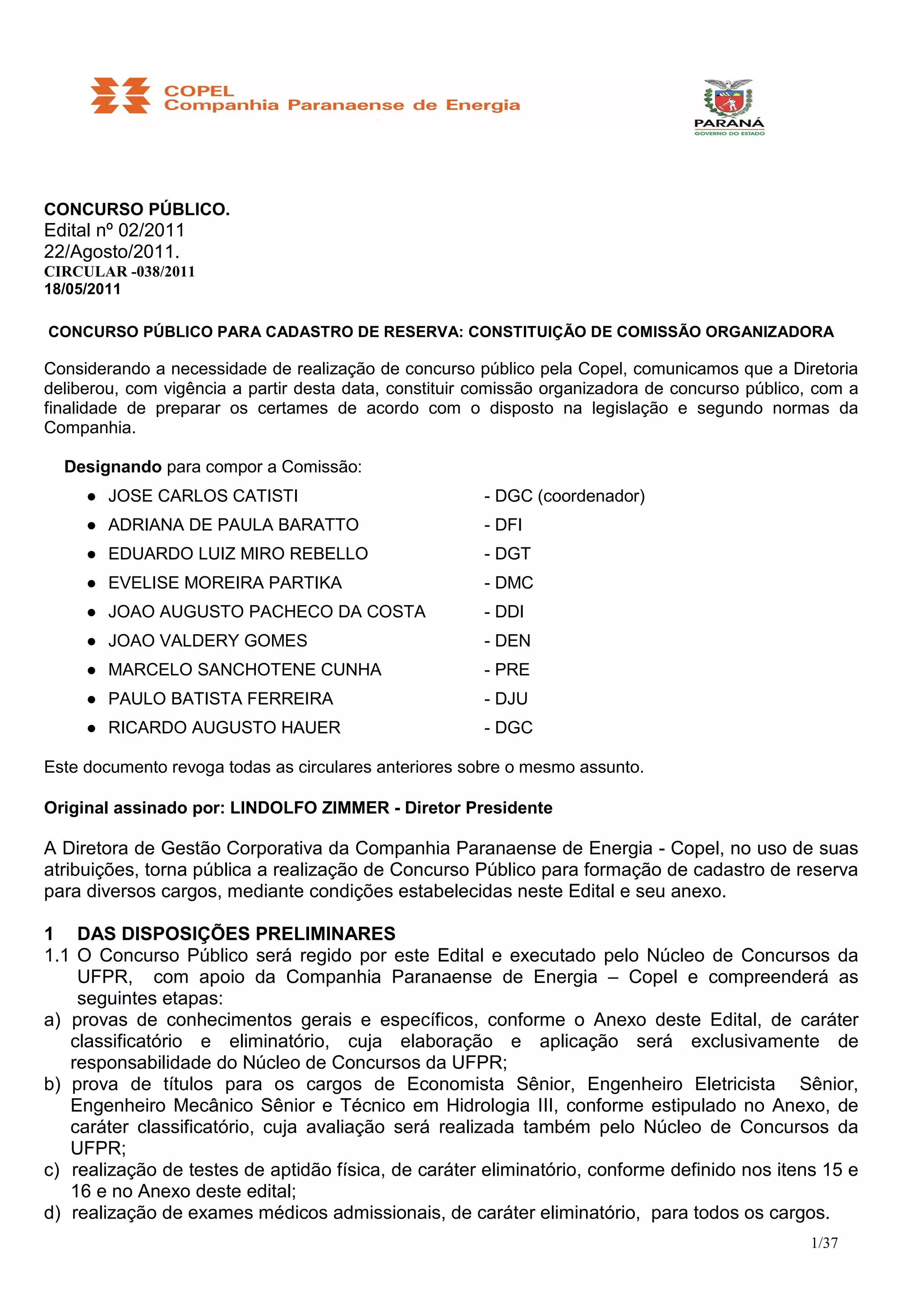 Este documento constitui um edital de concurso público para formação de cadastro de reserva para diversos cargos na Companhia Paranaense de Energia (Copel). O documento define as etapas do concurso, os cargos disponíveis e seus requisitos, as condições para admissão e contratação, e fornece instruções sobre como se inscrever.