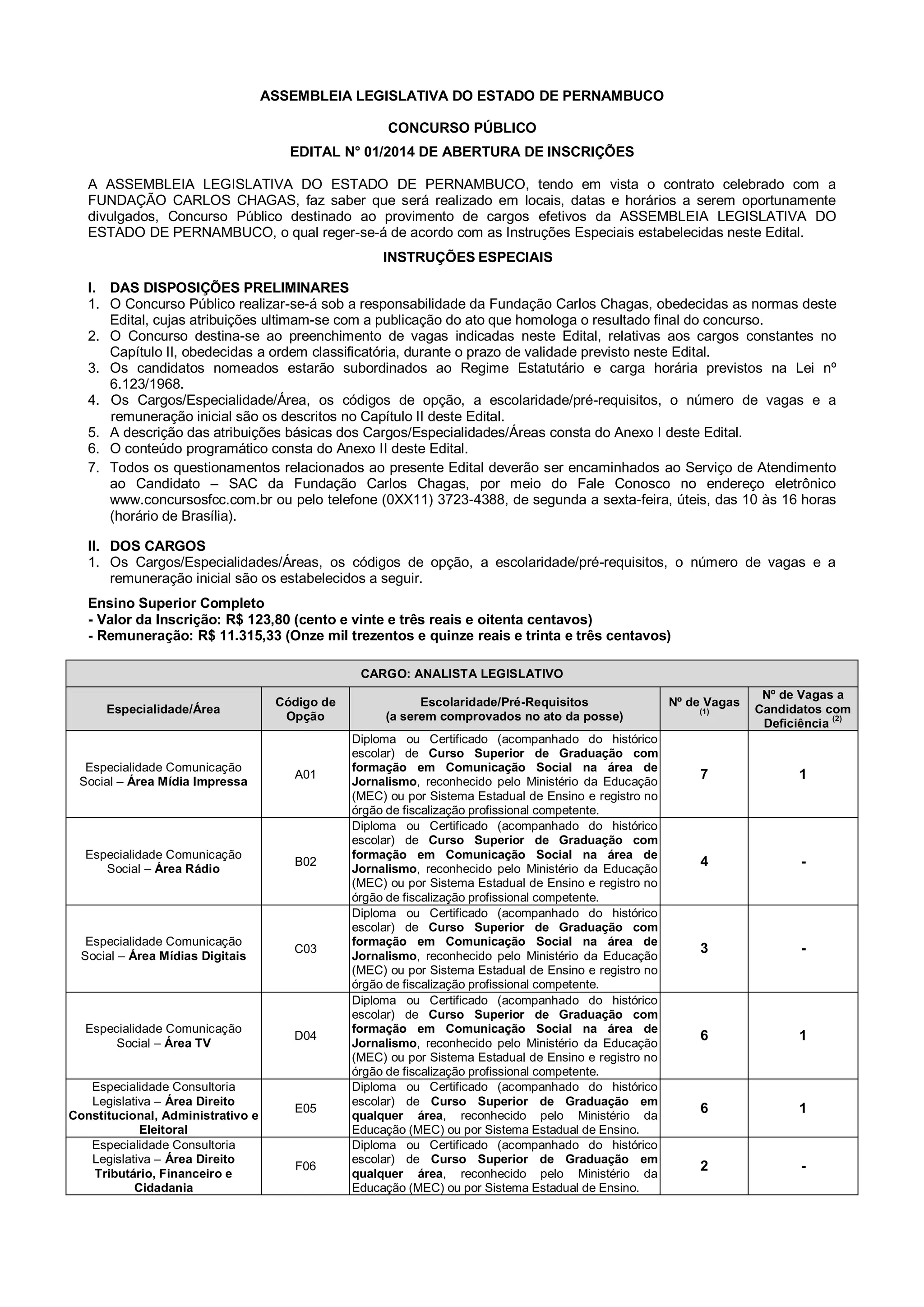 Este documento anuncia um concurso público para preenchimento de vagas na Assembleia Legislativa do Estado de Pernambuco. O concurso será realizado pela Fundação Carlos Chagas e oferece vagas para os cargos de Analista Legislativo e Agente Legislativo, com requisitos de escolaridade variando de ensino médio a superior. São descritas as etapas e prazos para inscrição no concurso, que devem ser realizadas exclusivamente pela internet no período de 03 a 24 de fevereiro de 2014.