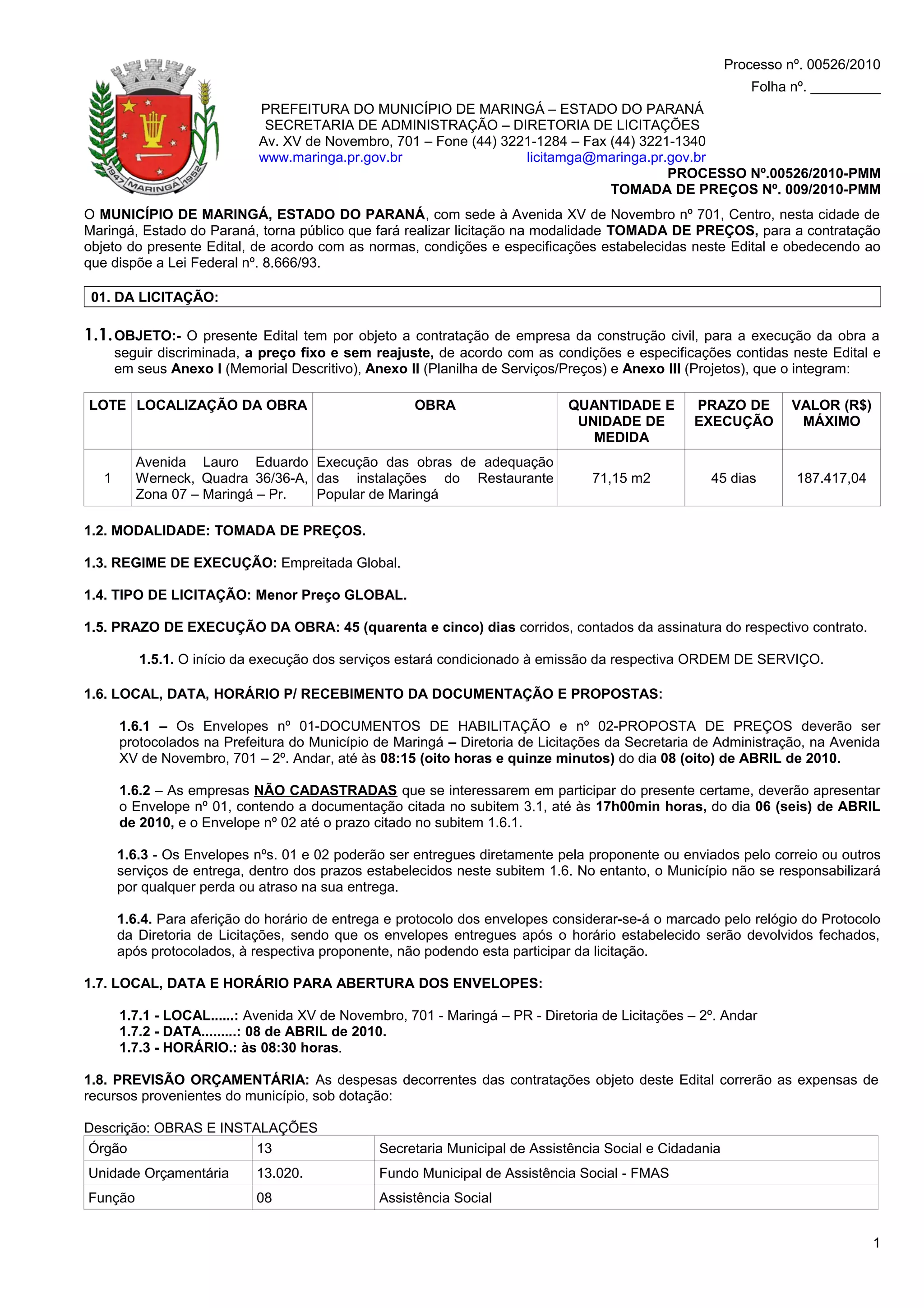 Este documento descreve uma licitação na modalidade de tomada de preços para a execução de obras de adequação das instalações do Restaurante Popular de Maringá. O objeto é a contratação de empresa da construção civil para realizar as obras em determinado endereço dentro de 45 dias pelo valor máximo de R$ 187.417,04. O documento especifica os requisitos de habilitação das empresas interessadas e os anexos que fazem parte do edital.