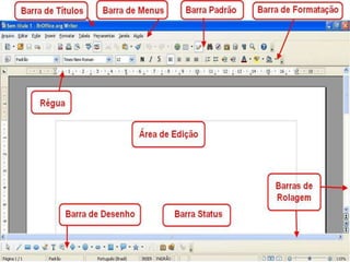 O documento discute editores de texto, planilhas de cálculo e editores de slides, ferramentas dos pacotes Office. Apresenta o Writer, Calc e Impress da suíte LibreOffice como alternativas gratuitas ao Word, Excel e PowerPoint.