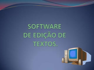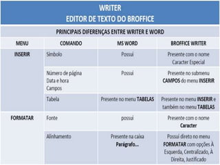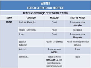 O documento discute editores de texto e softwares de escritório. Ele explica o que são editores de texto, licenças de software, Microsoft Office e BrOffice. Também discute as diferenças entre BrOffice Writer e Microsoft Word.