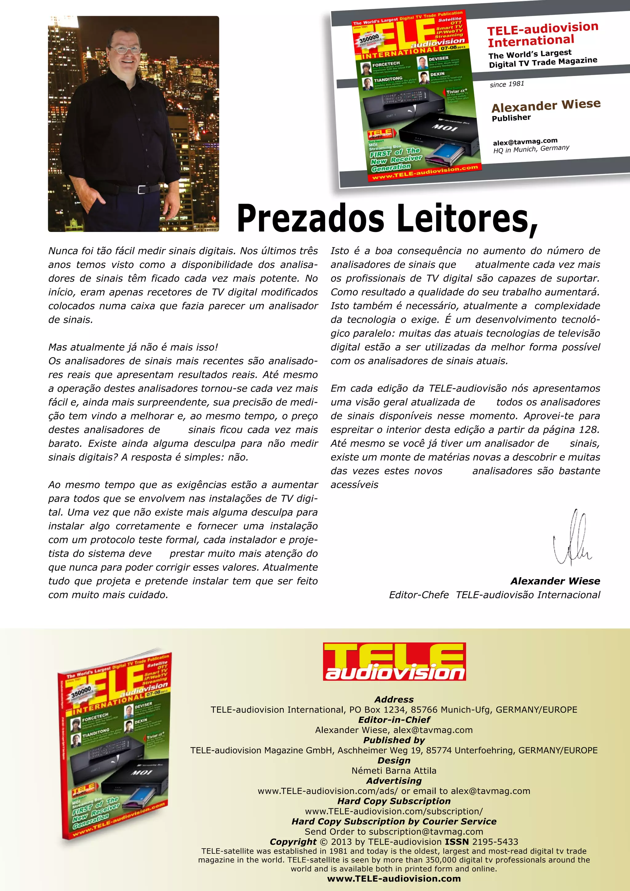 Este documento é um editorial da revista TELE-audiovision International, a maior revista de TV digital do mundo desde 1981. O editorial discute como a disponibilidade e qualidade de analisadores de sinais digitais melhorou nos últimos anos, tornando mais fácil medir sinais digitais com precisão. Isso aumenta a exigência para instaladores e projetistas de sistemas entregarem instalações digitais de alta qualidade. O editorial encoraja leitores a verem as novas opções de analisadores de sinais na edição atual da revista.