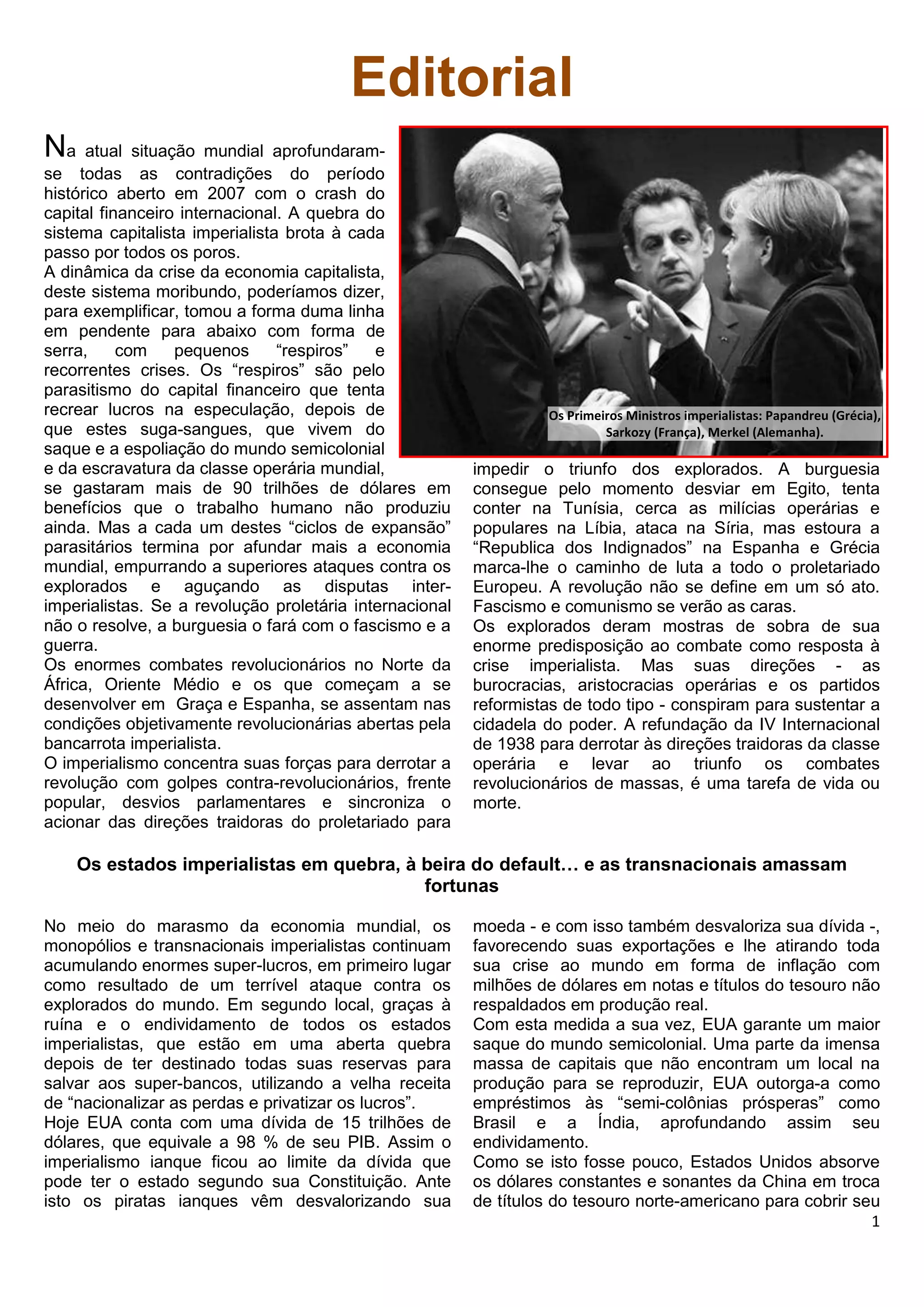 O documento discute a crise econômica mundial e suas consequências políticas. A crise se aprofundou desde 2007 e levou à falência vários estados, aumentando disputas entre potências imperialistas. A Grécia está à beira da falência e sua situação ameaça arrastar outros países da zona do euro. Isso intensifica disputas entre EUA, Alemanha e outras potências sobre como lidar com a dívida grega. Ao mesmo tempo, a classe operária na Grécia e em outros lugares começa a se rebelar contra os ataques result