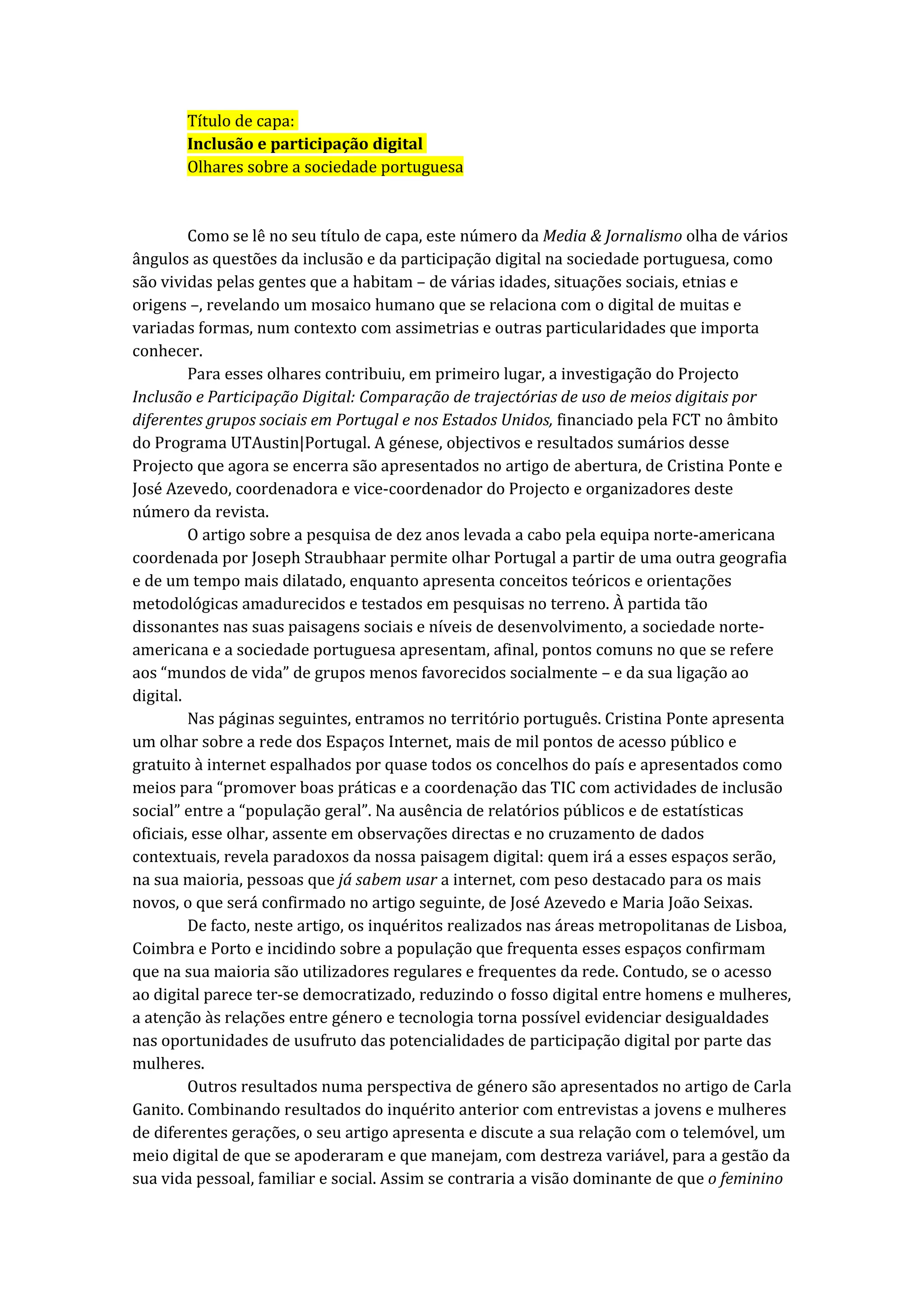 Este documento apresenta um resumo de um número da revista Media & Jornalismo que analisa a inclusão e participação digital na sociedade portuguesa através de vários artigos de investigação. Os artigos exploram tópicos como os Espaços Internet públicos, diferenças de gênero no acesso digital, uso do celular por jovens e mulheres, cultura digital de jovens negros, fotografia em redes sociais e o lançamento do computador Magalhães em Portugal.