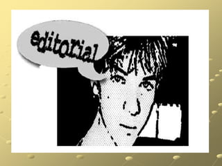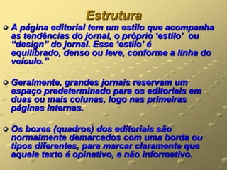 O documento discute as características e estrutura de editoriais em jornais. Apresenta que editoriais geralmente ocupam espaço fixo em duas ou mais colunas nas primeiras páginas internas e são demarcados por bordas ou tipos diferentes. Também descreve que editoriais devem apresentar o tema no primeiro parágrafo, contextualizá-lo e apresentar dados no segundo, analisar motivações e dar exemplos no terceiro, e concluir de forma crítica no quarto sem ser impressionista.