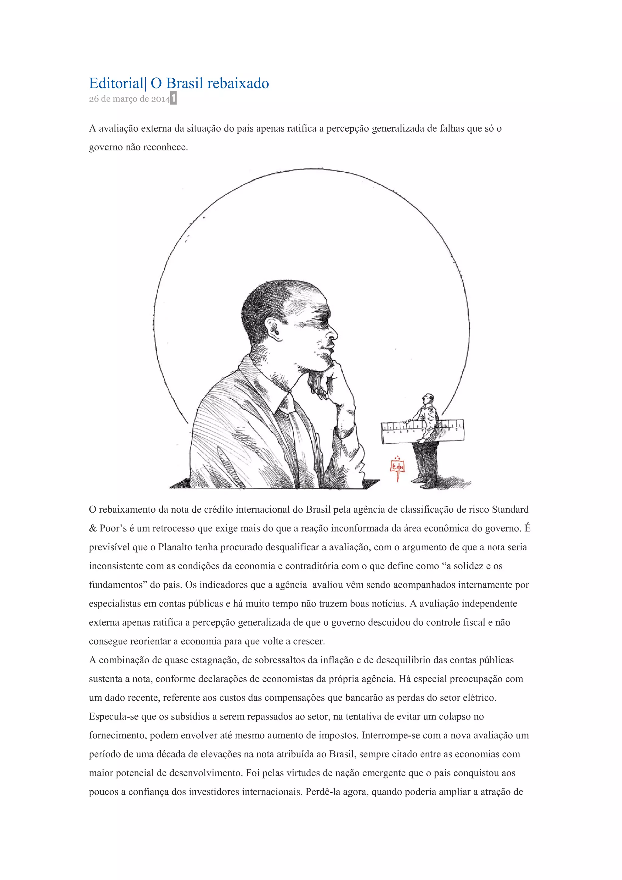 O documento discute o rebaixamento da nota de crédito do Brasil pela agência Standard & Poor's. Ele afirma que a avaliação externa apenas ratifica a percepção de falhas no controle fiscal e estagnação econômica. Além disso, destaca a preocupação com os custos das compensações para o setor elétrico e os efeitos da fragilização da Petrobras.