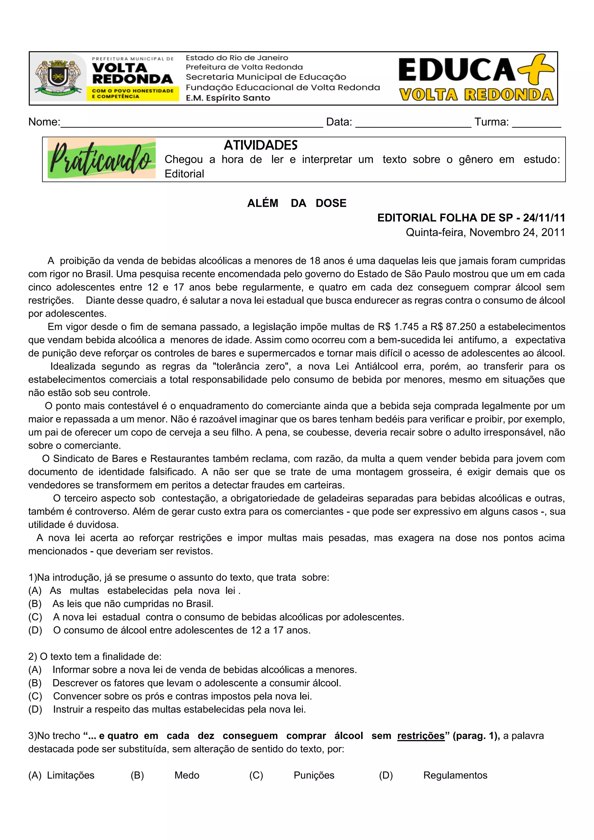 O documento é um editorial de jornal que discute a nova lei estadual de São Paulo que busca endurecer as regras contra o consumo de álcool por adolescentes. O texto apoia a lei, mas critica alguns pontos como a responsabilização total de estabelecimentos comerciais e a obrigatoriedade de geladeiras separadas.
