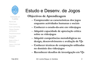 Este documento descreve um curso sobre Estudo e Desenvolvimento de Jogos na Universidade de Coimbra. O curso visa compreender as características dos jogos, conhecer técnicas de desenvolvimento de jogos, e fornecer competências para projetar e avaliar jogos. Os alunos completarão assignments individuais e um projeto em grupo, e serão avaliados continuamente ao longo do curso.