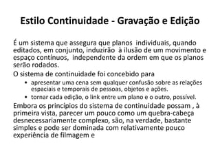 O documento discute os princípios do estilo de continuidade no cinema, incluindo: