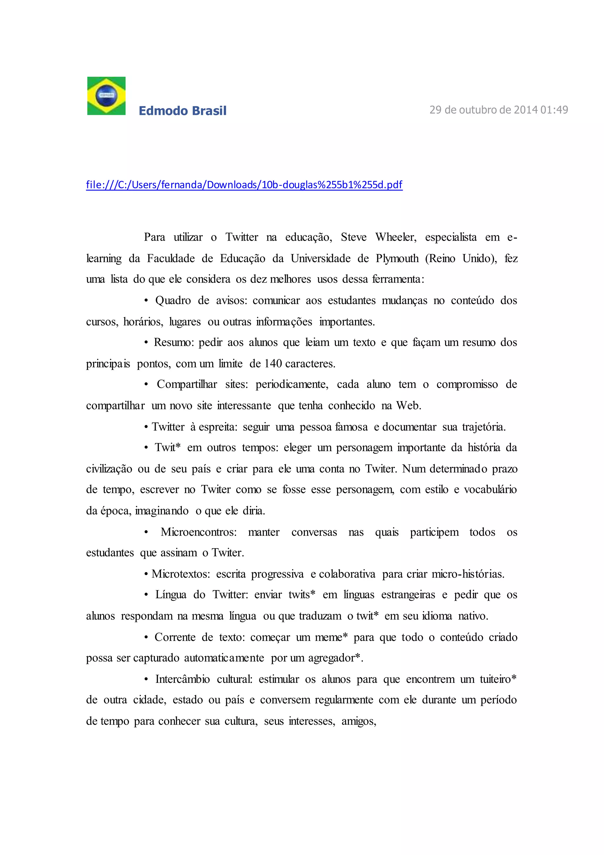O documento lista 10 usos educacionais do Twitter sugeridos por um especialista, como comunicar mudanças na aula, pedir resumos de textos limitados a 140 caracteres e estimular o intercâmbio cultural entre alunos de diferentes países. Além disso, discute que o Twitter requer rapidez e capacidade de síntese devido ao limite de caracteres, mas pode ser uma ferramenta útil para a educação se usado de forma adequada.