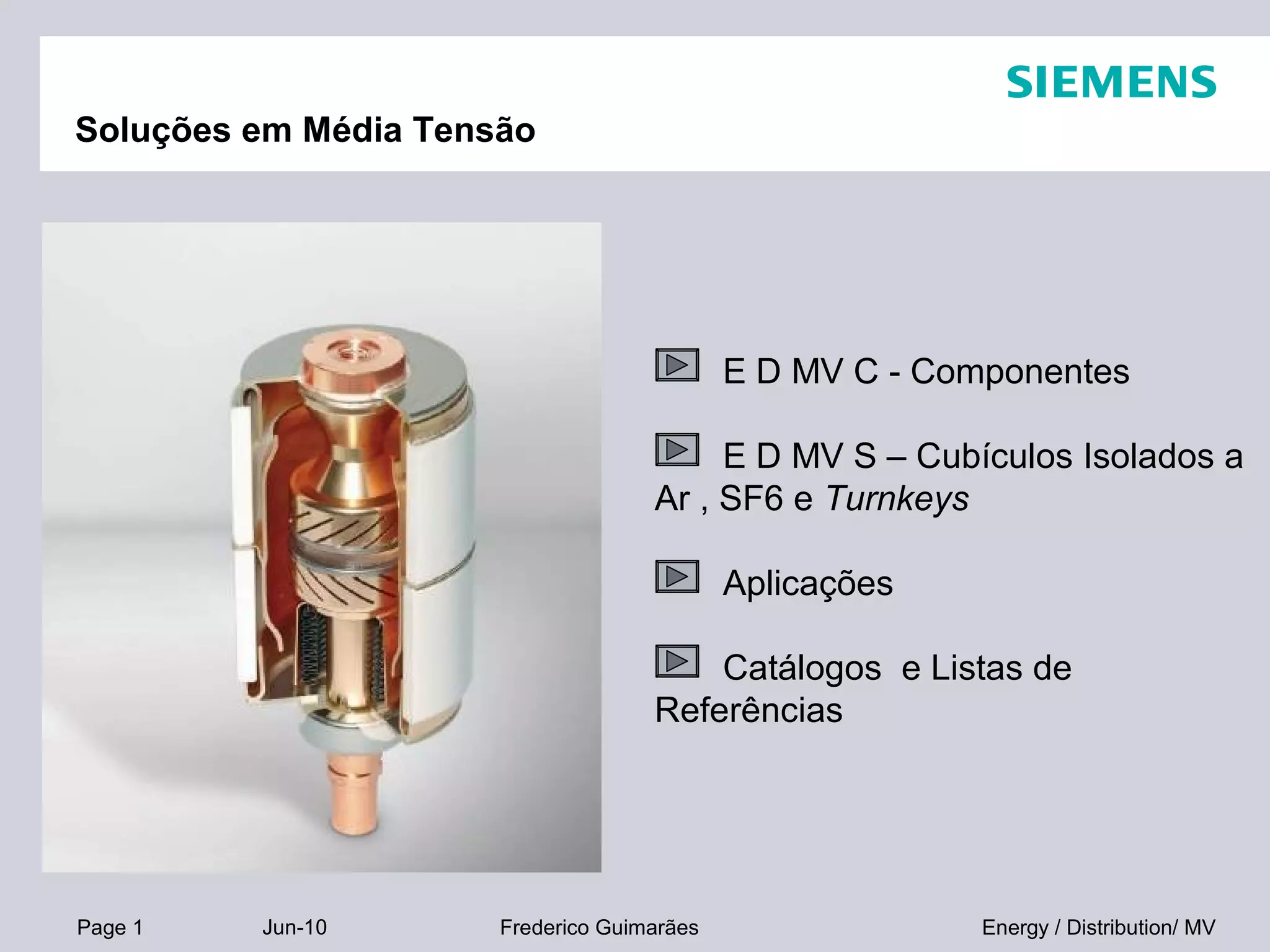 O documento descreve soluções de média tensão da Siemens, incluindo componentes, cubículos isolados a ar, SF6 e turnkey, além de aplicações e catálogos. É apresentada uma gama completa de disjuntores, religadores, contatores e outros componentes a vácuo para distribuição de energia, com especificações técnicas e áreas de aplicação. Cubículos isolados a ar são descritos como soluções seguras e confiáveis para necessidades de média tensão.