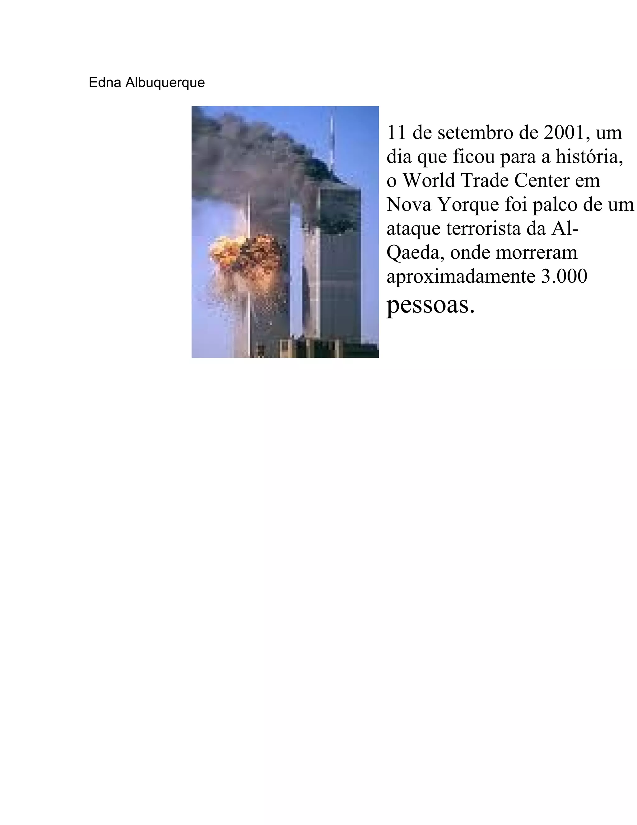 O documento descreve o ataque terrorista de 11 de setembro de 2001, quando a Al-Qaeda derrubou as Torres Gêmeas do World Trade Center em Nova York, resultando na morte de cerca de 3.000 pessoas.
