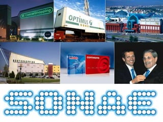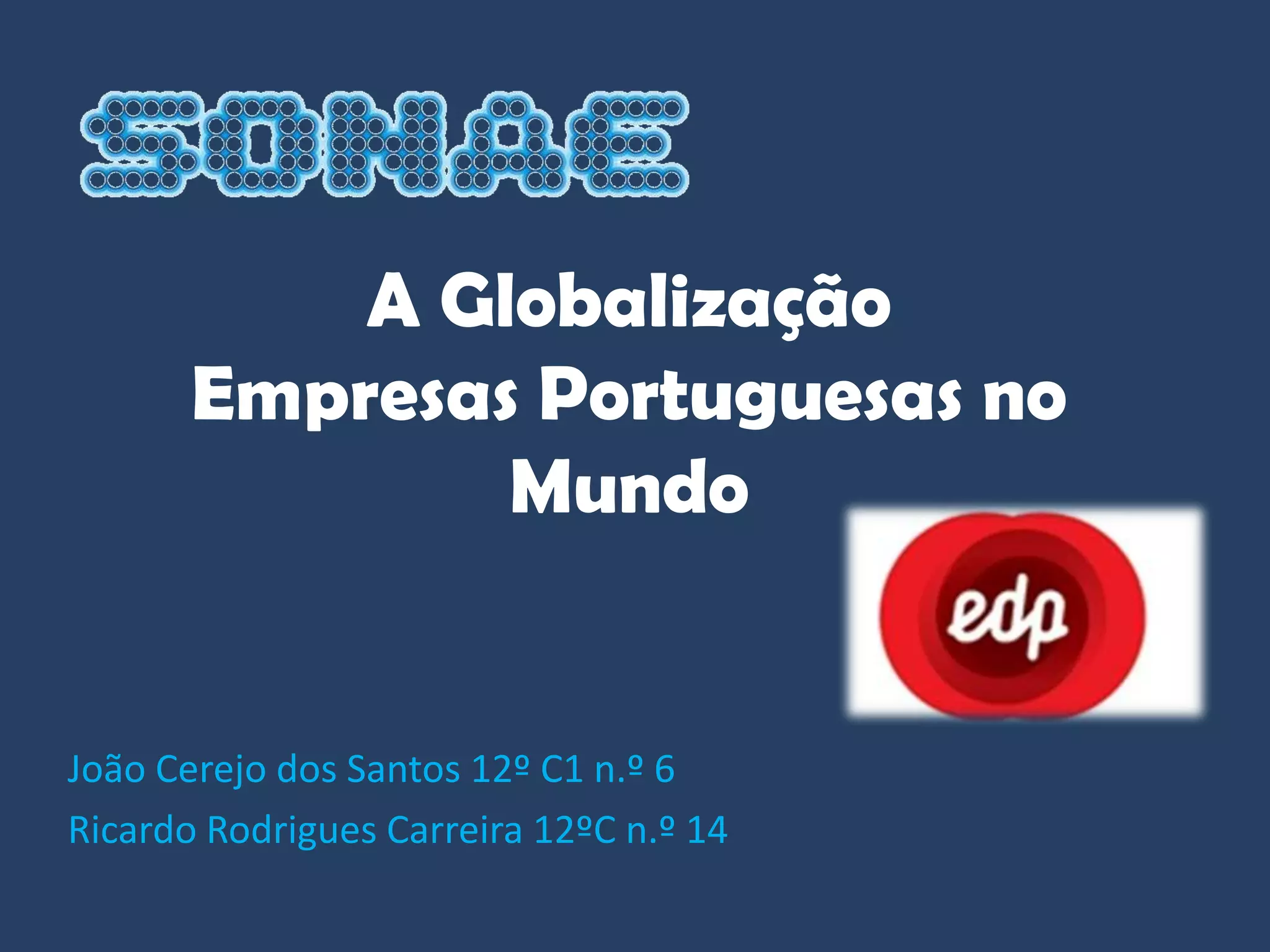O documento discute as empresas portuguesas EDP e SONAE e suas operações globais. Ele descreve como a EDP opera em geração de energia eólica e distribuição de eletricidade em países como Brasil e Espanha. Também explica como a SONAE opera em varejo e indústria através de marcas como Zippy, Sport Zone e Worten em Portugal e outros países.