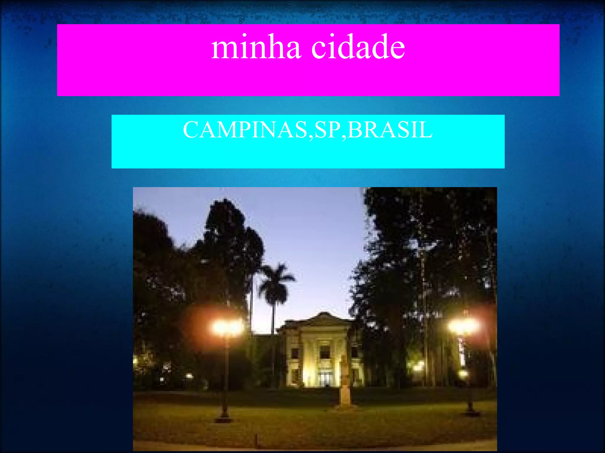 Campinas é uma cidade localizada no estado de São Paulo, Brasil. É descrita como uma cidade linda. O documento fornece o nome e localização de Campinas.