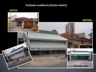 O documento apresenta imagens de antes e depois de diversos projetos de decoração e reforma de ambientes residenciais e comerciais, incluindo fachadas, salas de estar e jantar, cozinhas, suítes, varandas, piscinas e lojas. As imagens mostram como cada ambiente foi decorado e reformado pela empresa.