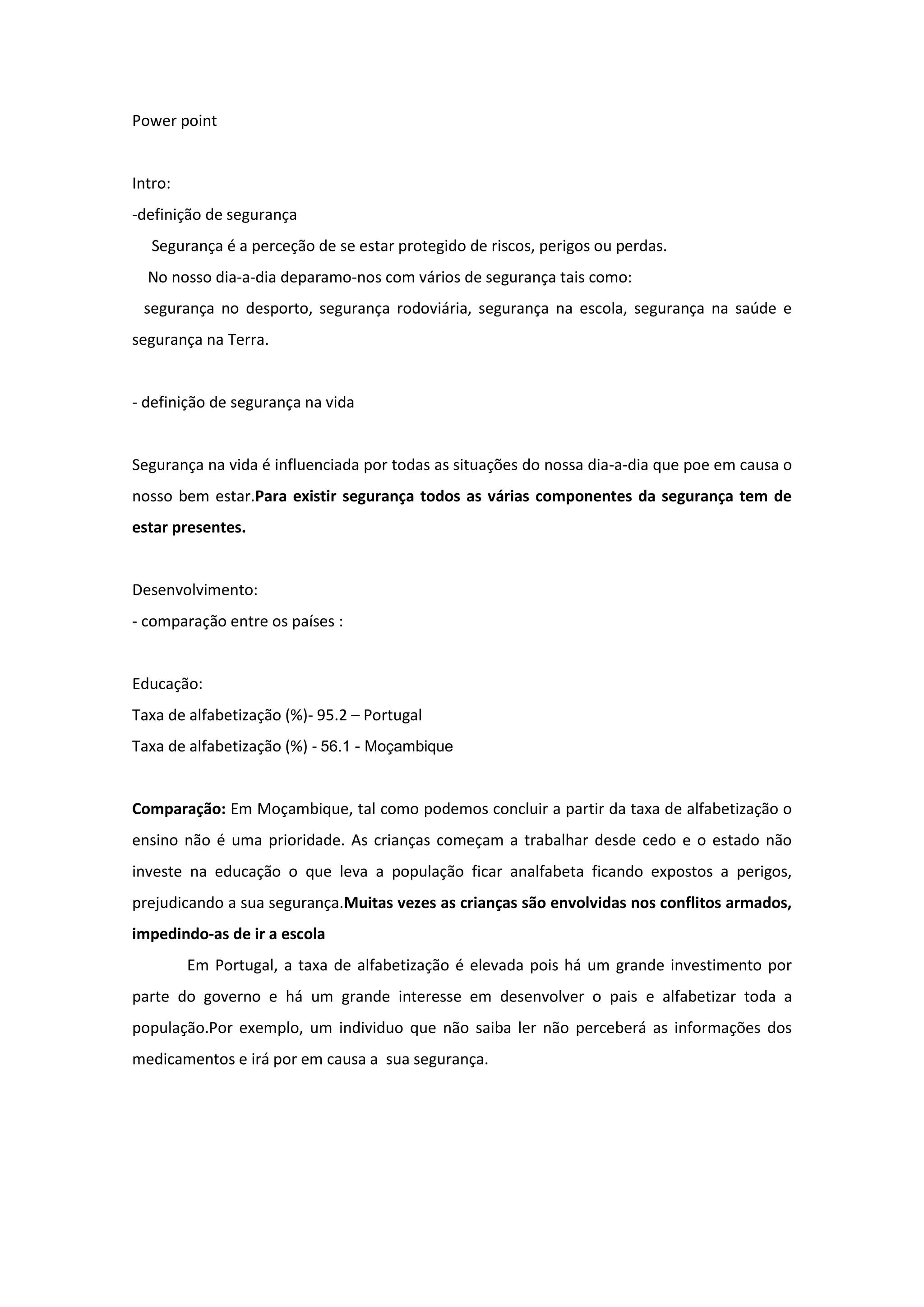 O documento compara aspectos da segurança entre Portugal e Moçambique, como educação, saúde, economia e vias de comunicação. Em geral, Portugal tem maiores índices de alfabetização, melhores serviços médicos, economia mais forte e infraestrutura de transporte mais desenvolvida do que Moçambique, levando a uma percepção maior de segurança entre a população portuguesa.
