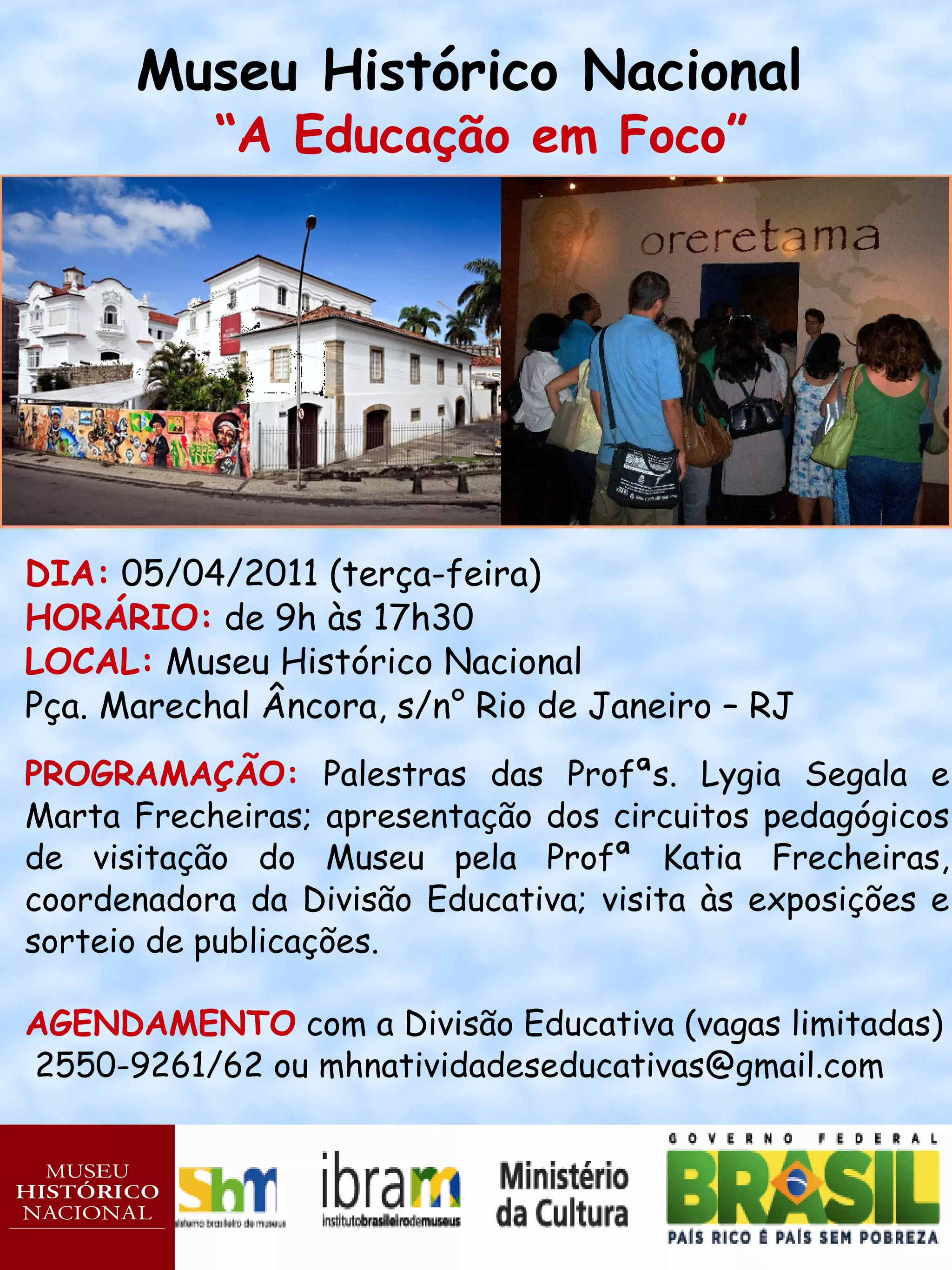 O Museu Histórico Nacional realizará um evento em 05/04/2011 sobre educação, com palestras de professoras, apresentação dos circuitos pedagógicos de visitação do museu pela coordenadora da Divisão Educativa e visita às exposições, com sorteio de publicações. O agendamento é feito pela Divisão Educativa.