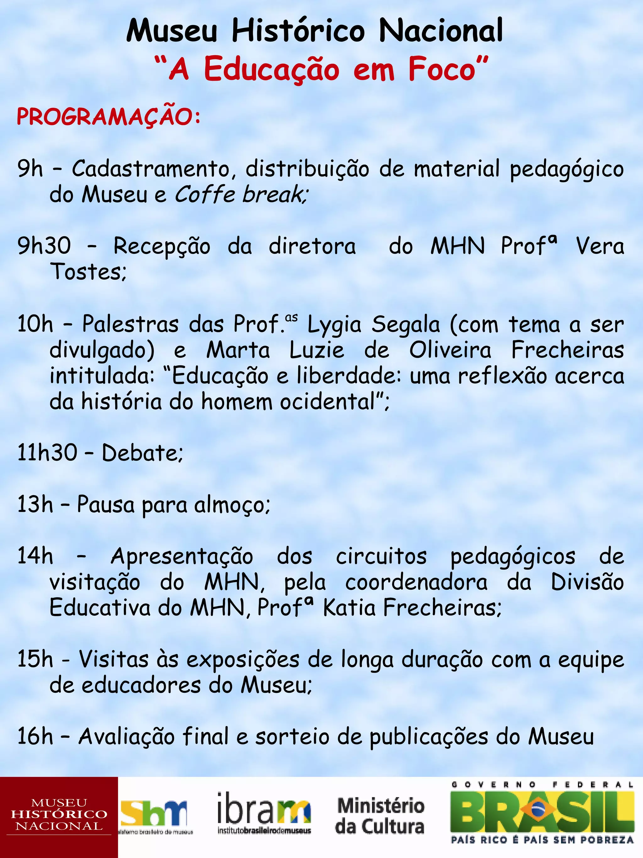 O programa inclui o cadastramento dos participantes, palestras sobre educação e liberdade no homem ocidental e circuitos pedagógicos de visitação às exposições do Museu Histórico Nacional, com debate, almoço e avaliação final.