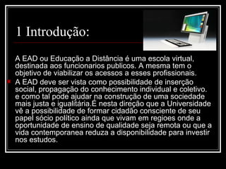 O documento discute a educação a distância (EAD), definindo-a como uma modalidade de ensino em que o professor e o aluno estão separados no espaço e interagem por meios tecnológicos. Aborda os conceitos básicos da EAD, seu histórico, aplicações em empresas e diferenças em relação ao ensino presencial. Conclui ressaltando a importância crescente da EAD nos dias de hoje.