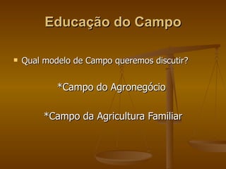 O documento discute os modelos de campo do agronegócio e da agricultura familiar, abordando as demandas da educação do campo no NRE de Toledo. Apresenta também a trajetória e concepção da educação do campo segundo as diretrizes curriculares do Paraná.