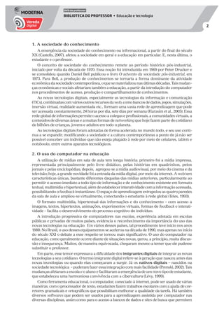 O documento discute como as tecnologias digitais estão afetando o papel do professor e o processo de ensino-aprendizagem. Apresenta como ao longo da história diferentes tecnologias foram usadas para transmitir conhecimento e como isso impactou o papel do professor, desde a oralidade até as tecnologias digitais atuais. Também discute como as novas tecnologias e a internet estão moldando um novo perfil de aluno, chamado de "nativo digital".