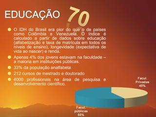 O documento discute o desenvolvimento do Brasil em áreas como educação, saúde e acesso à internet. Apresenta estatísticas que mostram a evolução do IDH brasileiro e redução dos índices de analfabetismo e o crescimento do acesso à educação superior. Também discute as mudanças no mundo do trabalho e a necessidade de adaptação constante aos avanços tecnológicos.