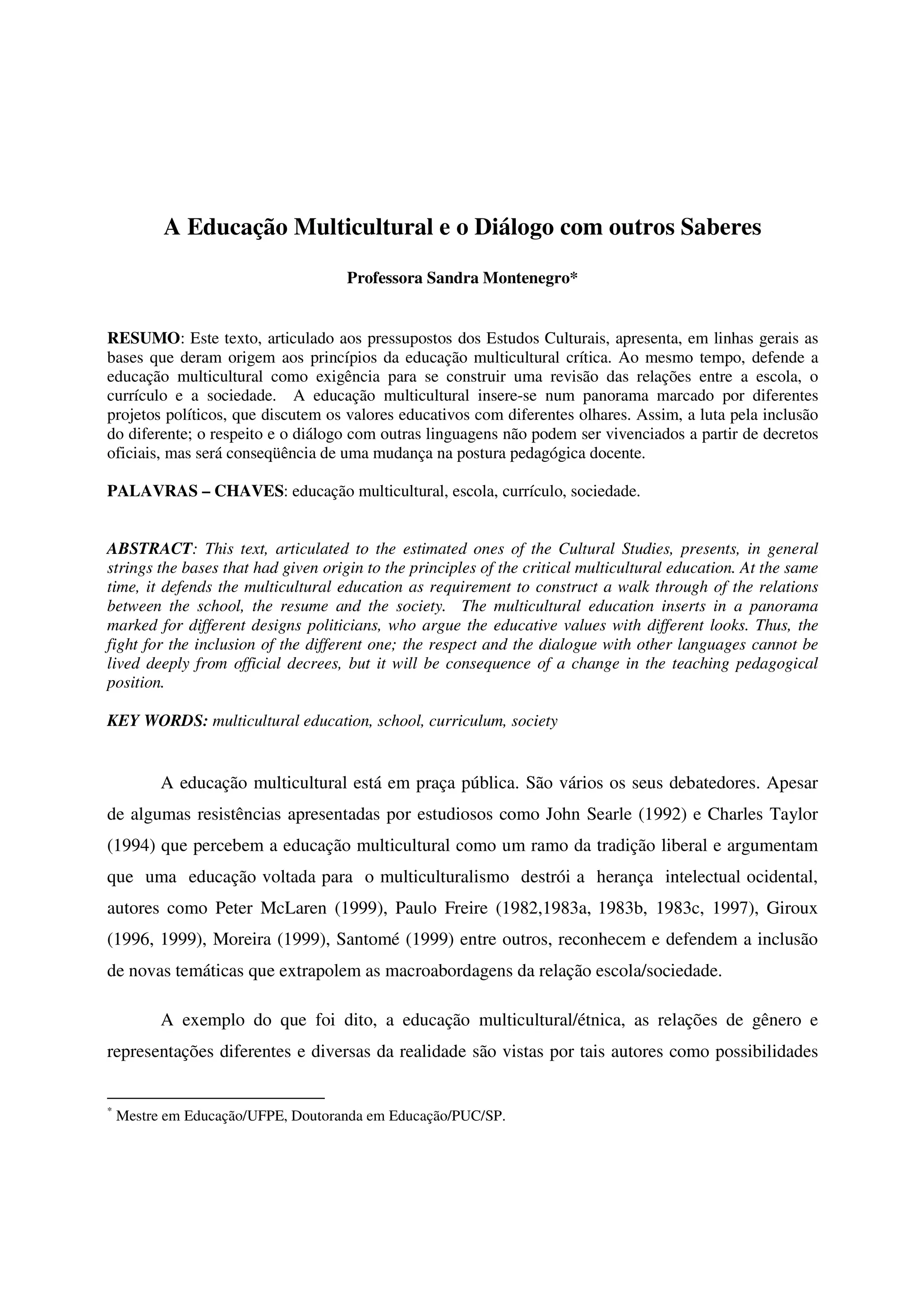 Este documento discute a educação multicultural e sua importância para a construção de uma escola democrática e inclusiva. Defende que a educação multicultural promove o diálogo entre diferentes saberes e culturas, combatendo visões opressoras. Vários autores e movimentos sociais ao longo da história apoiaram esse tipo de educação, visando a igualdade e a transformação social. No entanto, existem visões conflitantes sobre o multiculturalismo ligadas a projetos políticos diferentes.